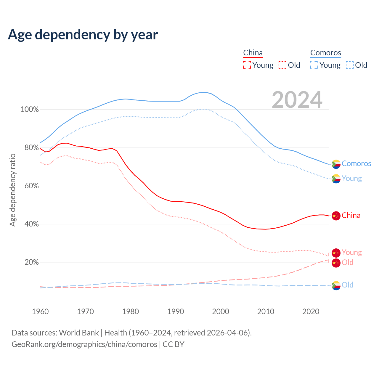 - China is ranked 44/196 by median age (oldest to youngest) vs 152/196 for Comoros.