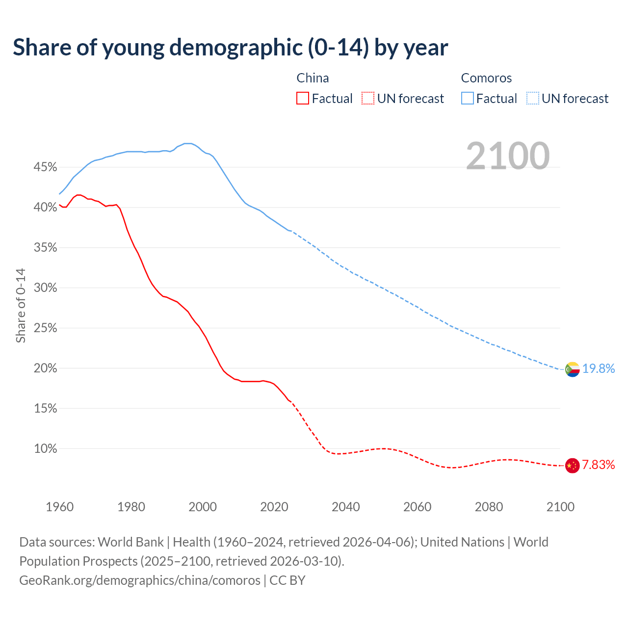 - The share of young demographic (0-15 years old) in China is 16% vs 37.1% in Comoros.