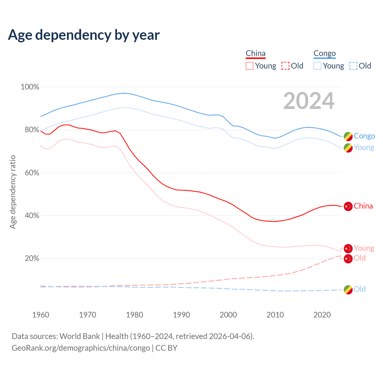 - China is ranked 44/196 by median age (oldest to youngest) vs 170/196 for the Congo.