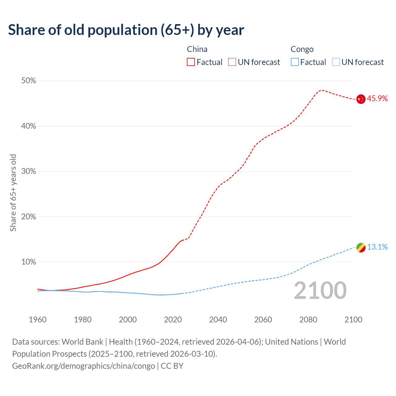 The share of older people aged 65 and over is 14.7% in China and 2.99% in the Congo. Life expectancy in China compared to the Congo .