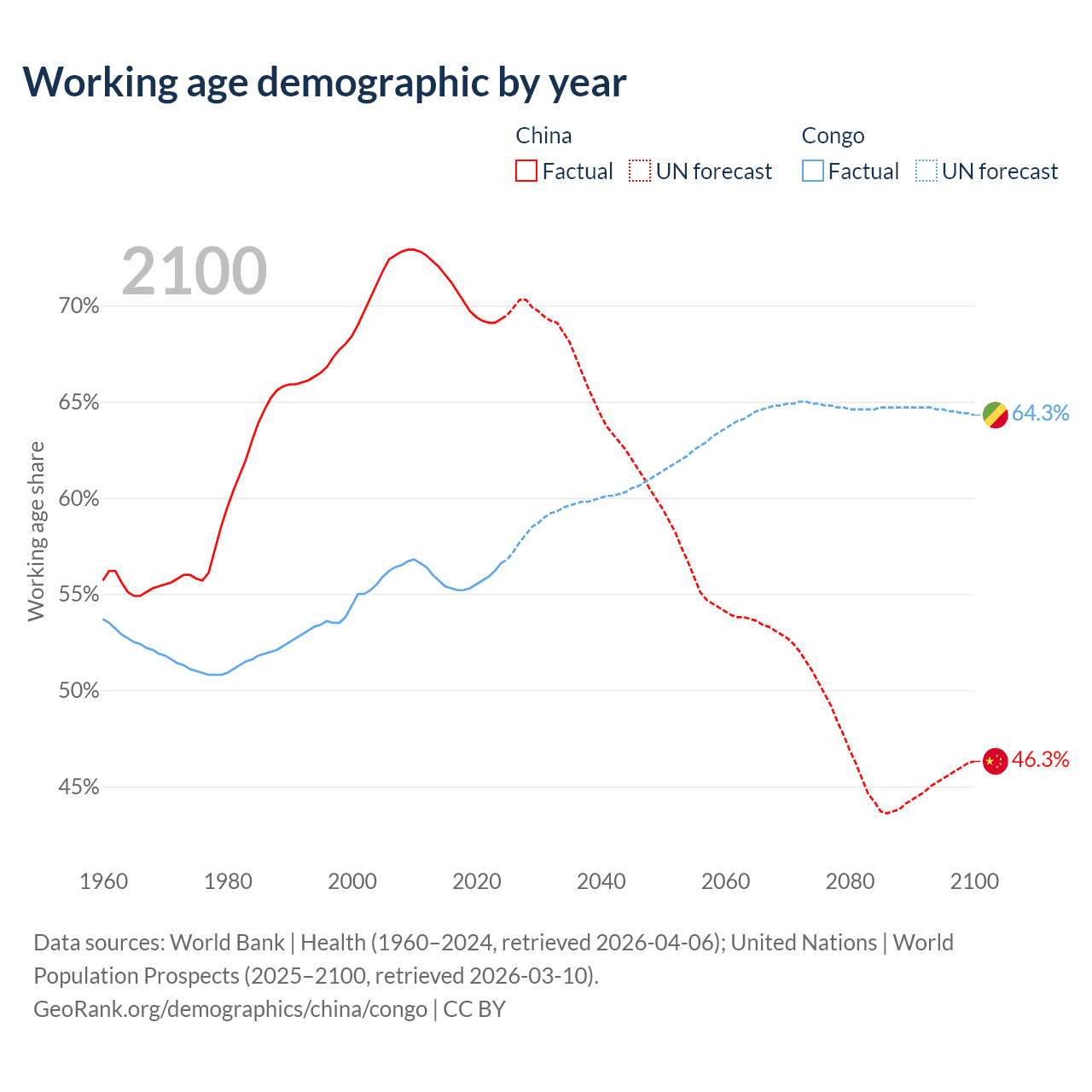 - China has 972M working age adults (aged 15-64) vs 3.78M in the Congo.