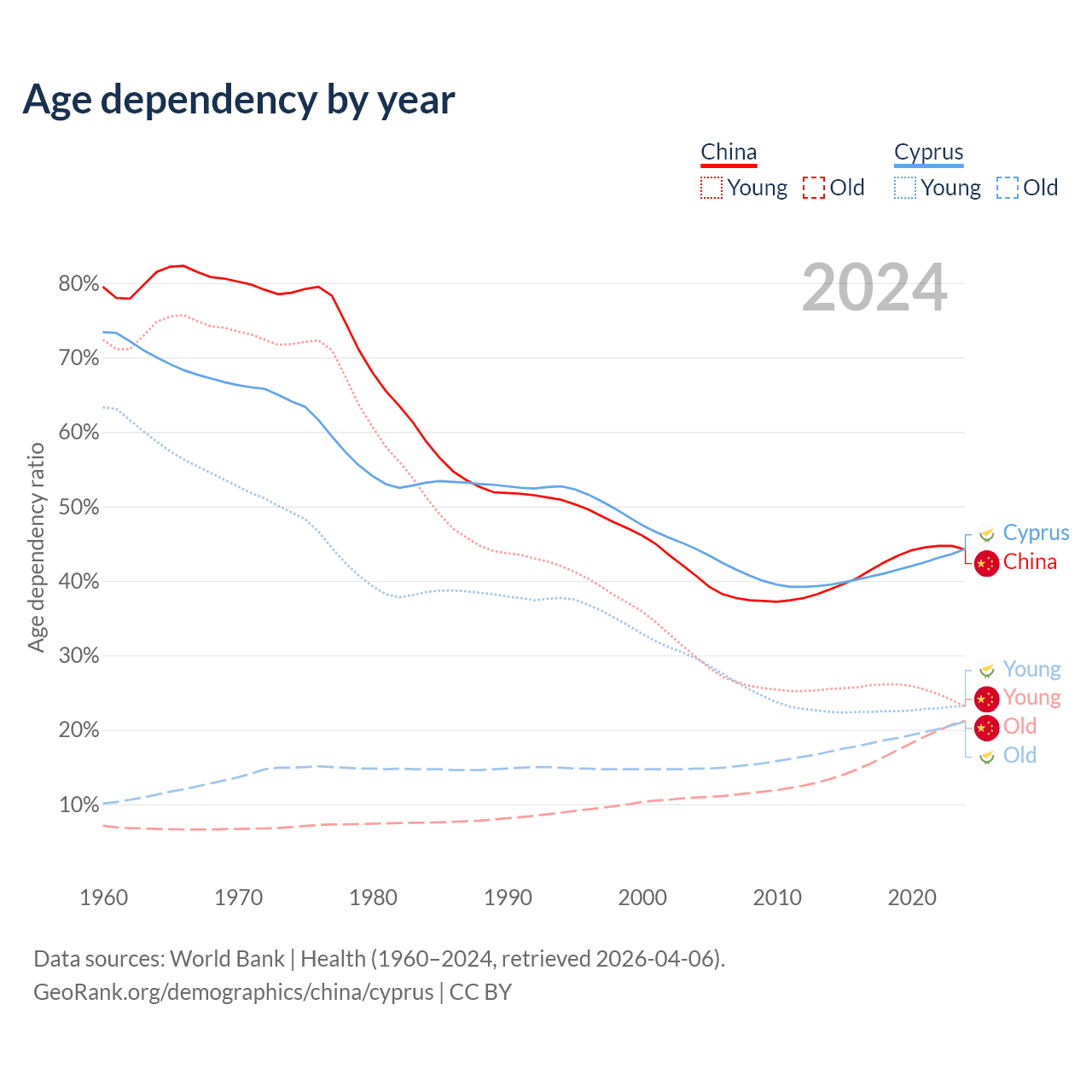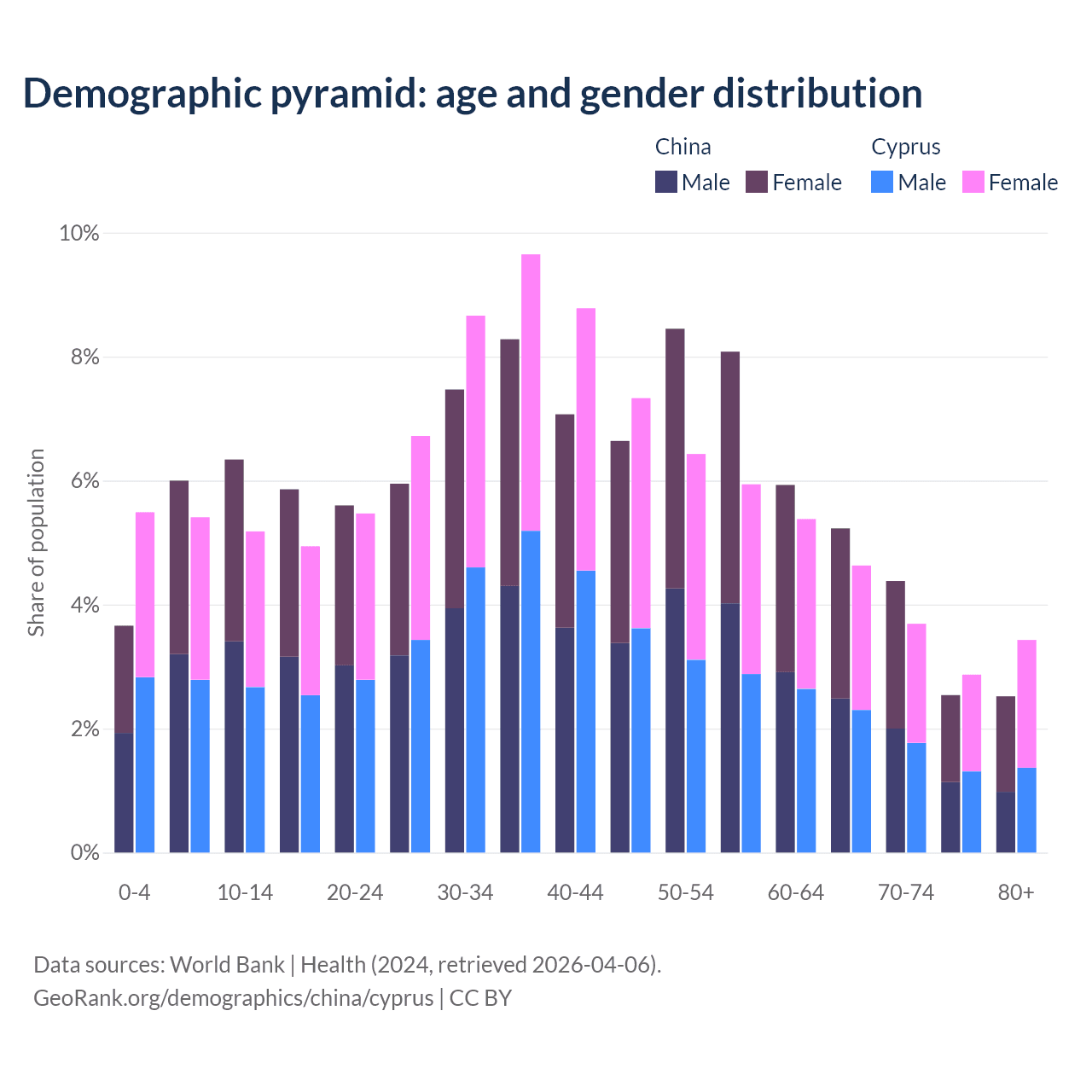- China is ranked 44/196 by median age (oldest to youngest) vs 52/196 for Cyprus.