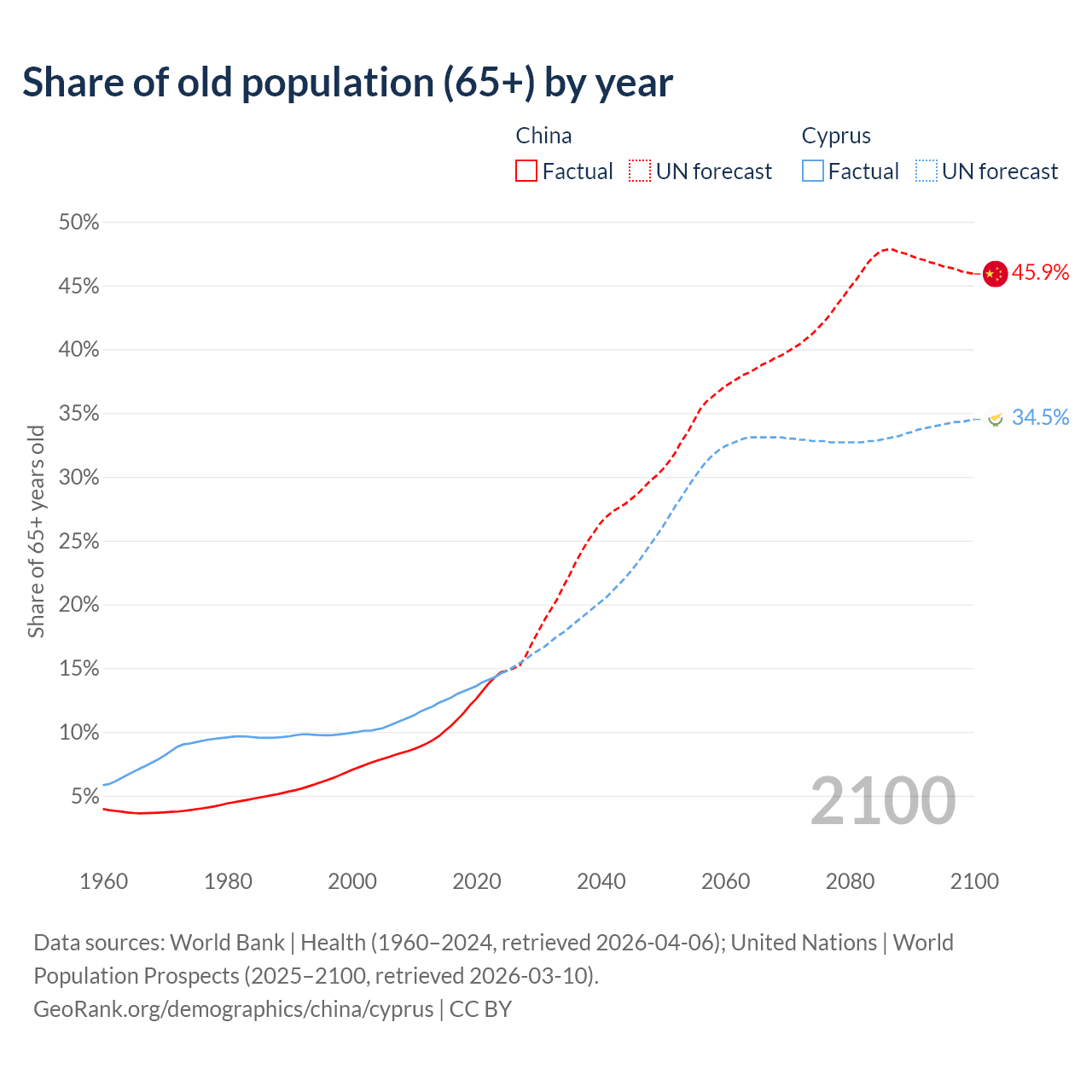 - The share of old-age demographic (65+) in China is 14.7% vs 14.6% in Cyprus.