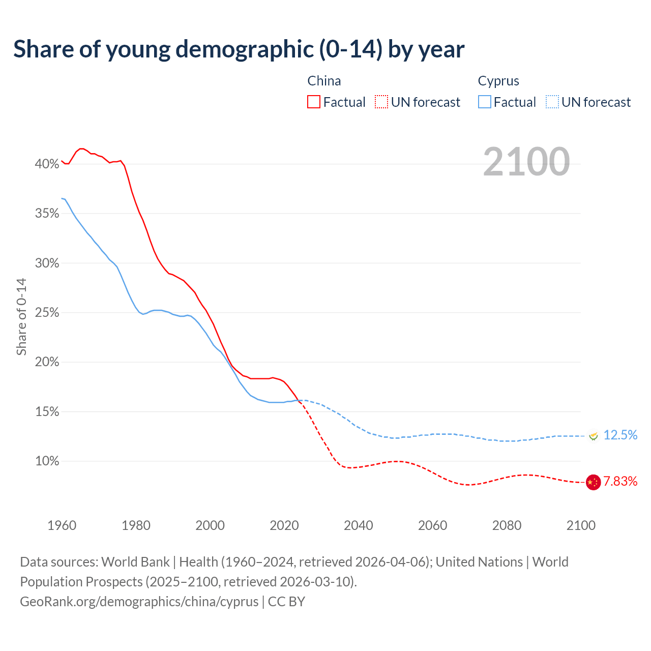 - The share of young demographic (0-15 years old) in China is 16% vs 16.1% in Cyprus.