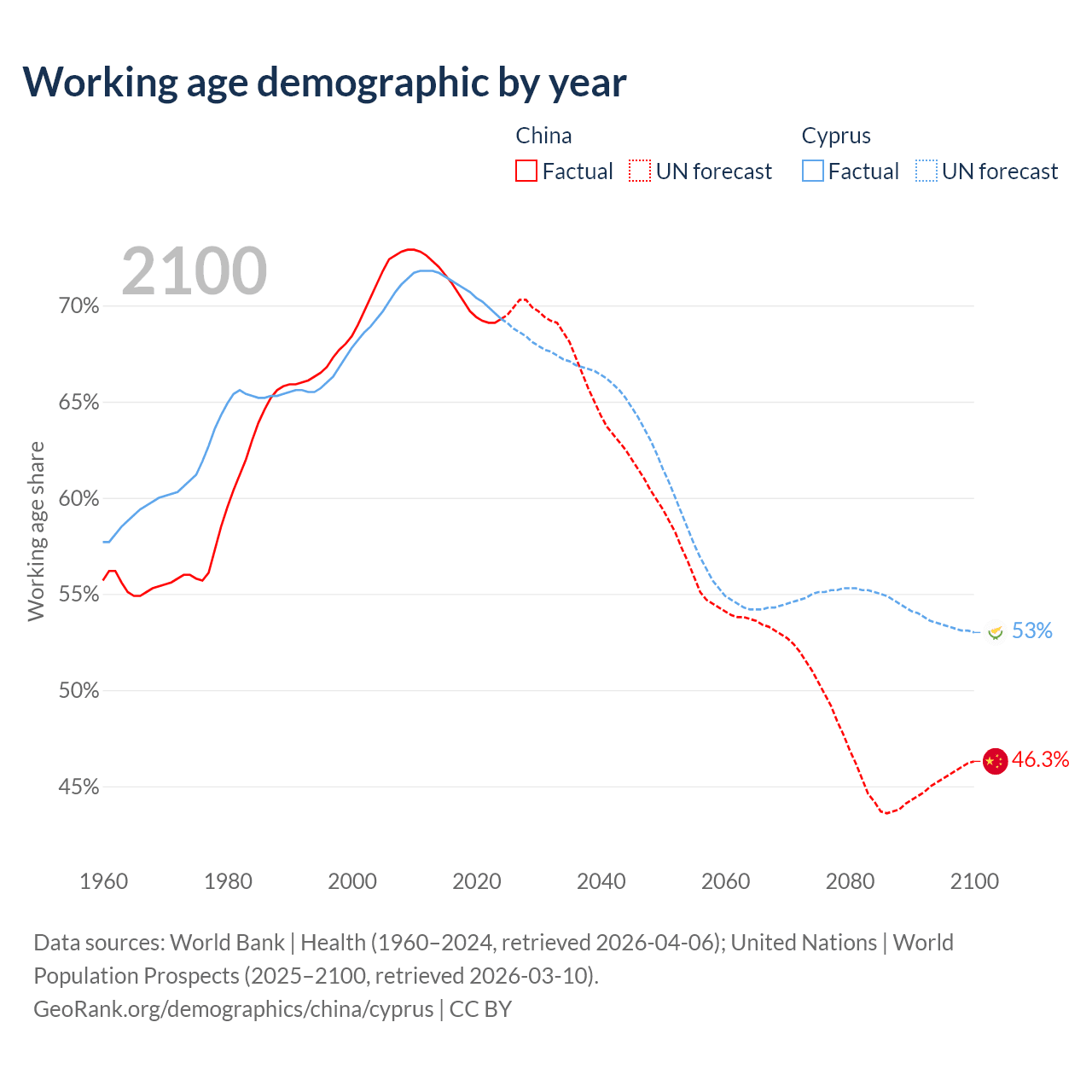 - China has 972M working age adults (aged 15-64) vs 961K in Cyprus.