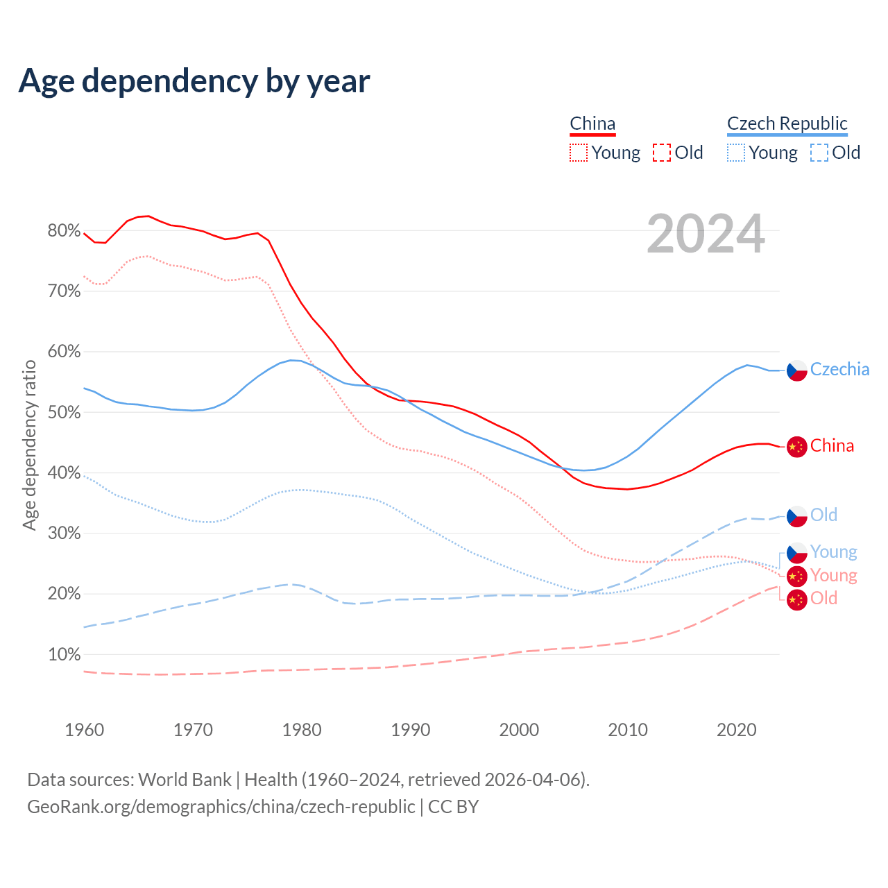- China is ranked 44/196 by median age (oldest to youngest) vs 21/196 for the Czech Republic.