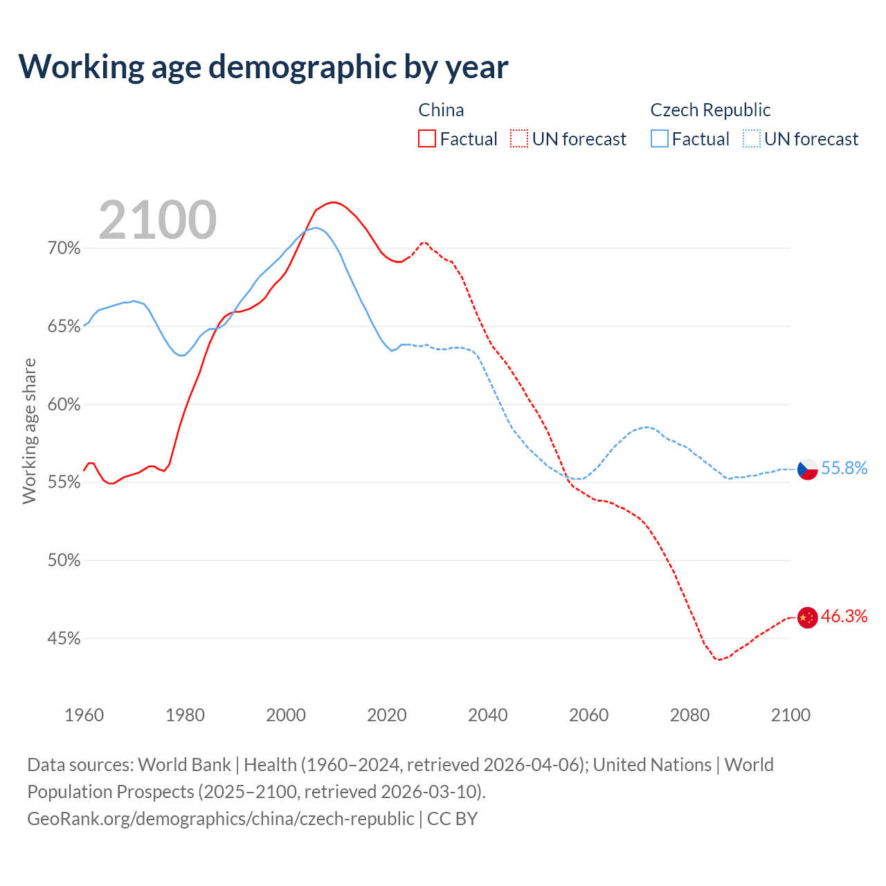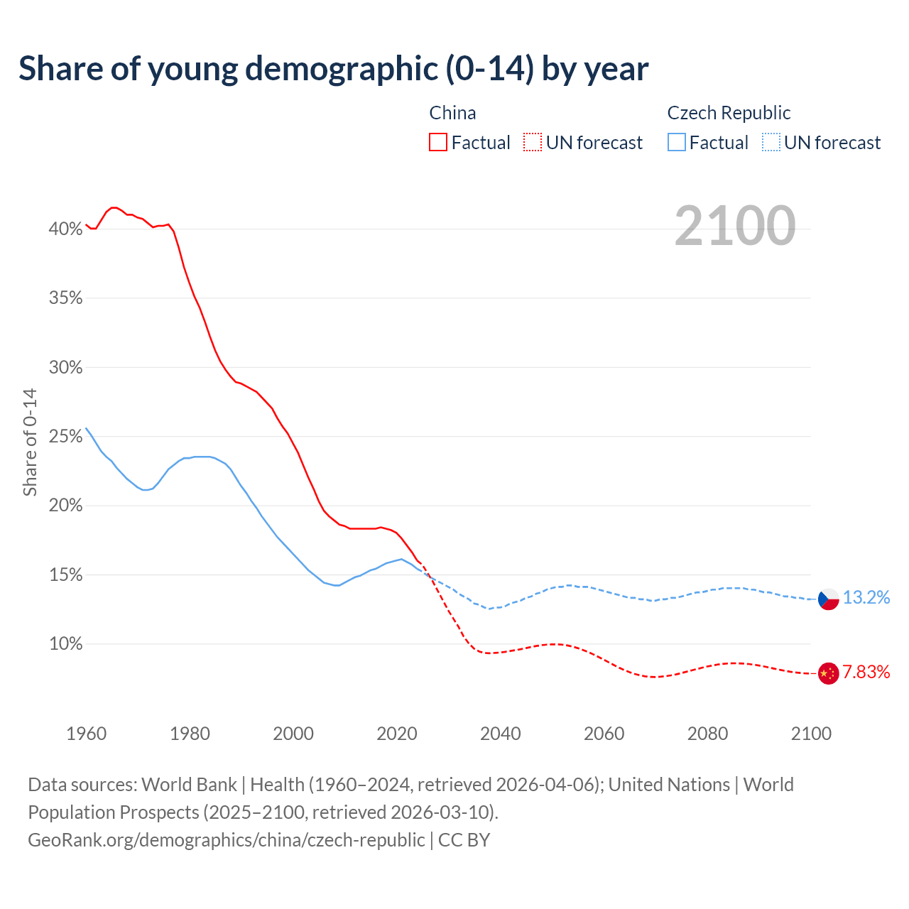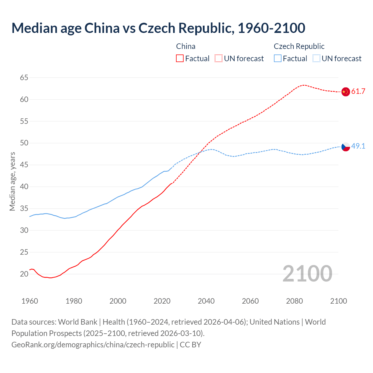 Median age China vs Czech Republic, 1960-2100