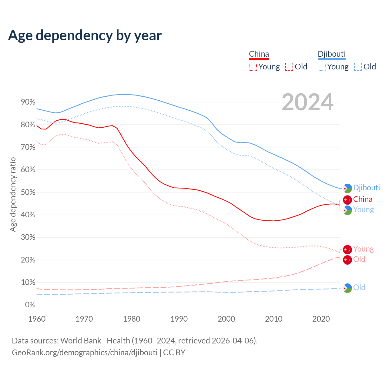- China is ranked 44/196 by median age (oldest to youngest) vs 129/196 for Djibouti.
