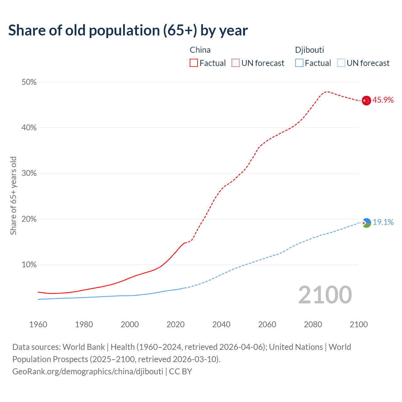 The share of older people aged 65 and over is 14.7% in China and 4.85% in Djibouti. Life expectancy in China compared to Djibouti .