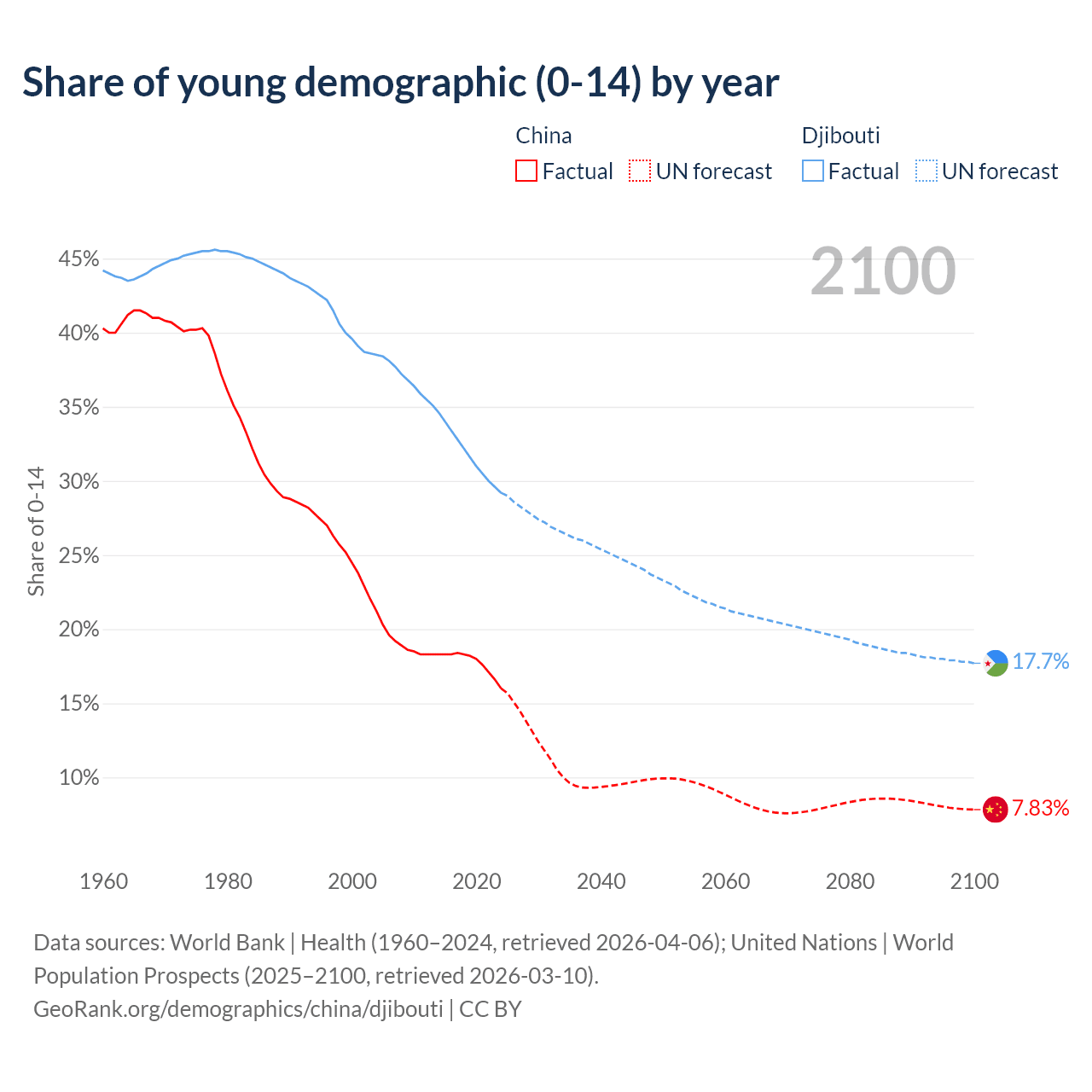 Median age China vs Djibouti, 1960-2100