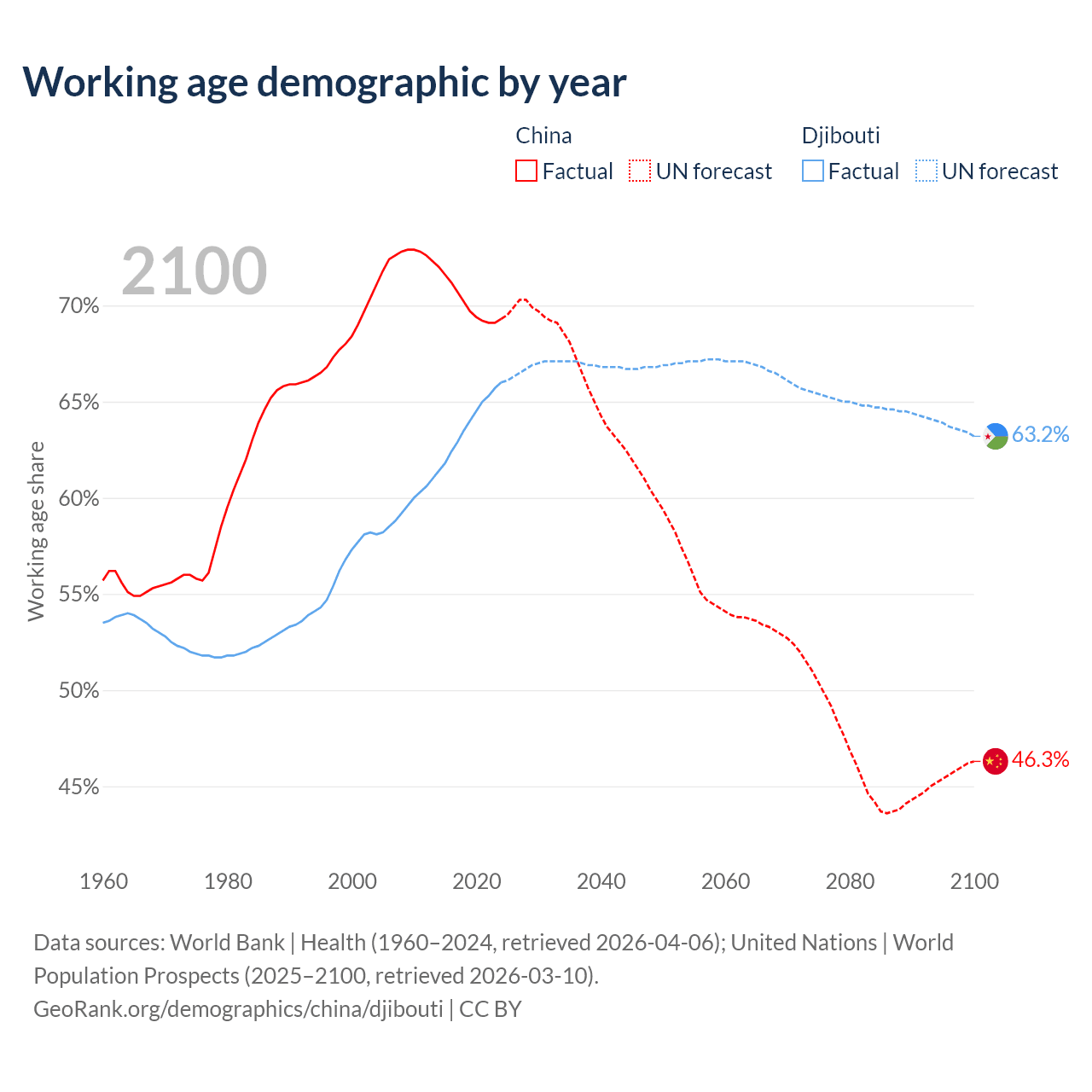 - China has 972M working age adults (aged 15-64) vs 794K in Djibouti.