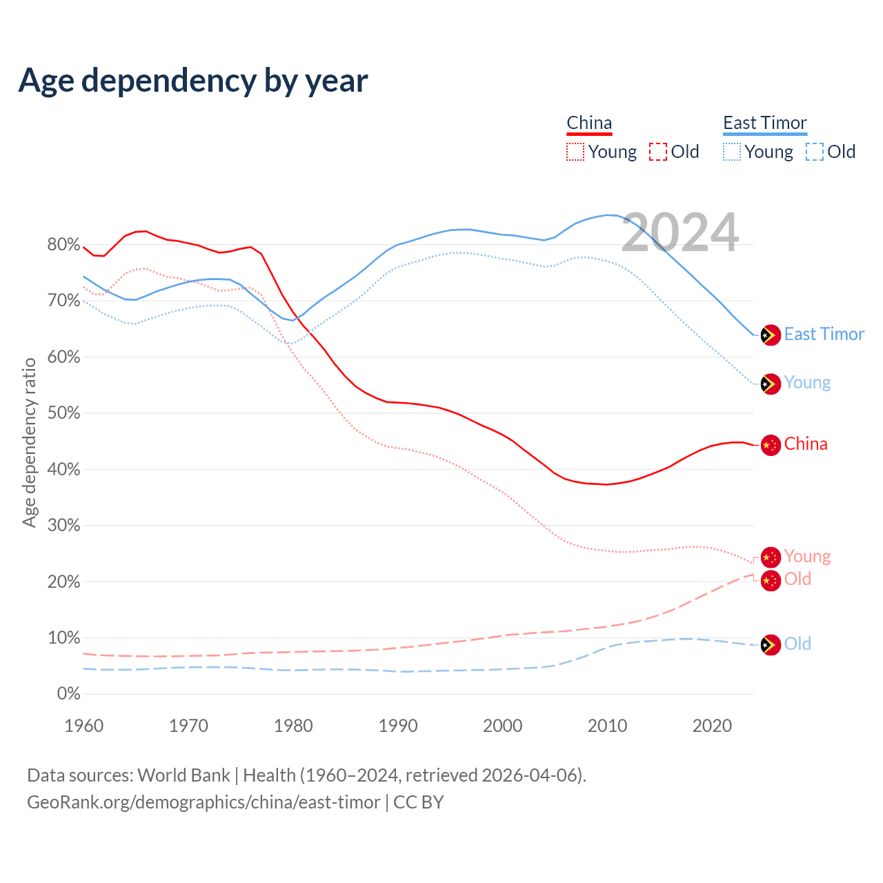 - China is ranked 44/196 by median age (oldest to youngest) vs 145/196 for East Timor.
