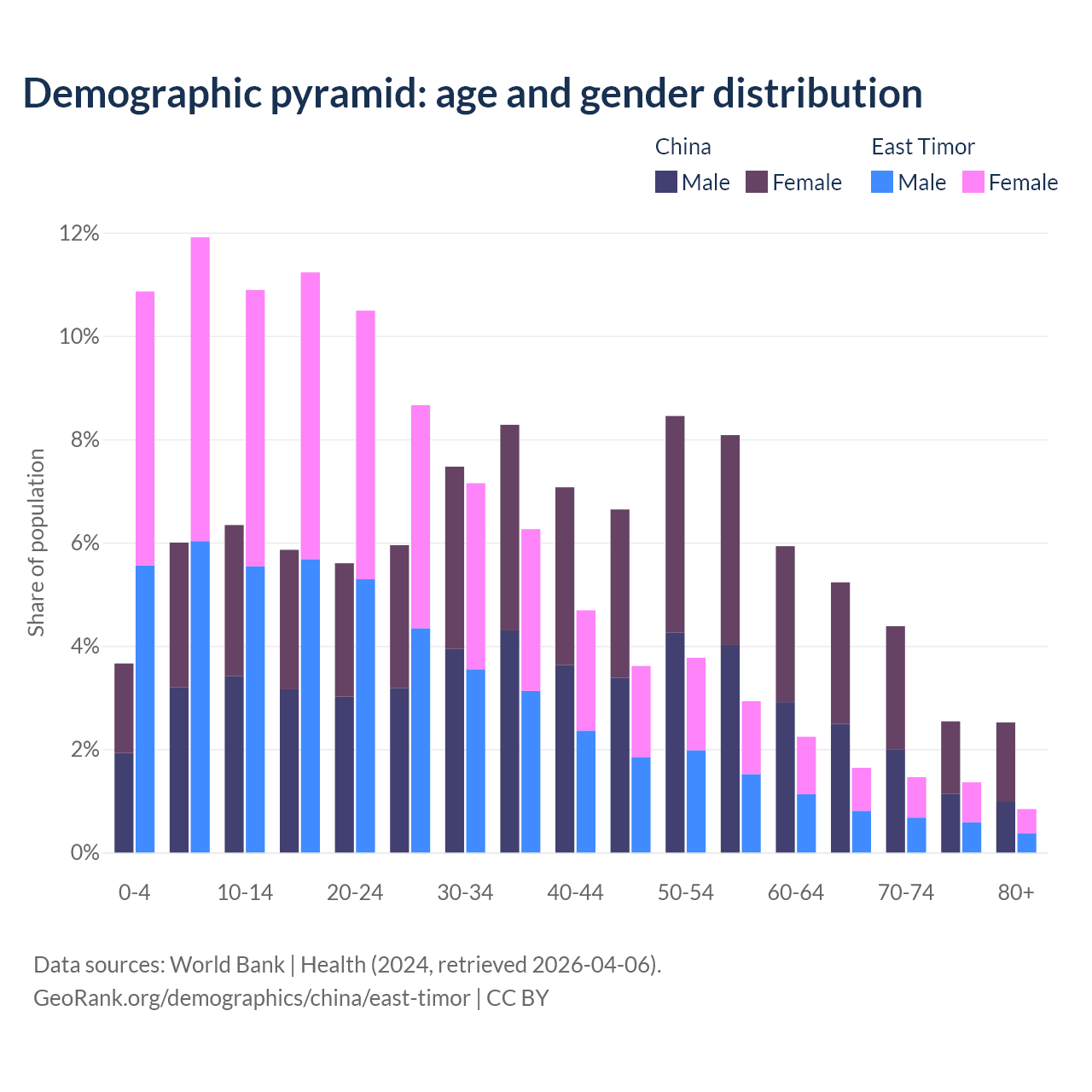 - As of 2026, the population of China is 1.4B vs 1.44M in East Timor - 973 times difference.