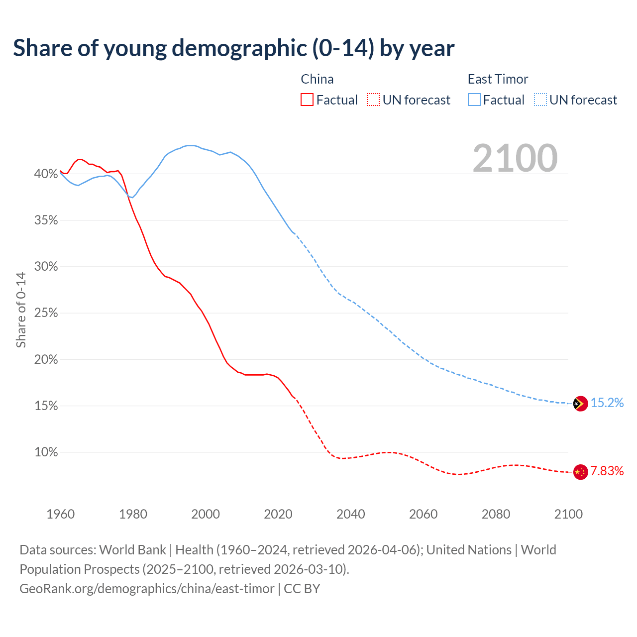 - The share of young demographic (0-15 years old) in China is 16% vs 33.7% in East Timor.