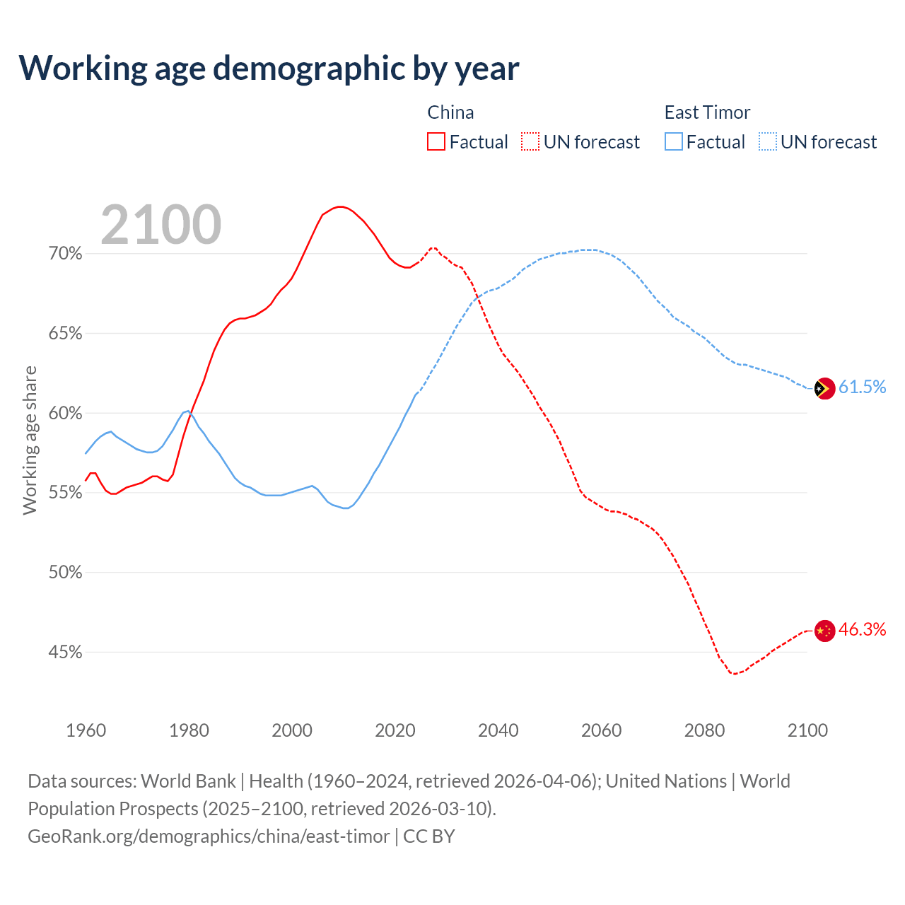 - China has 972M working age adults (aged 15-64) vs 880K in East Timor.