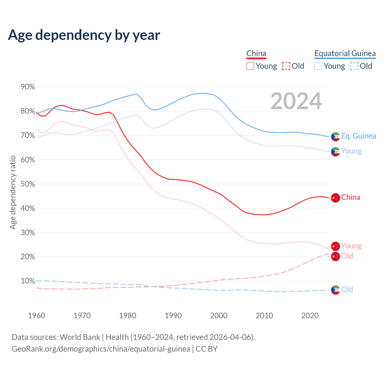 - China is ranked 44/196 by median age (oldest to youngest) vs 148/196 for Equatorial Guinea.