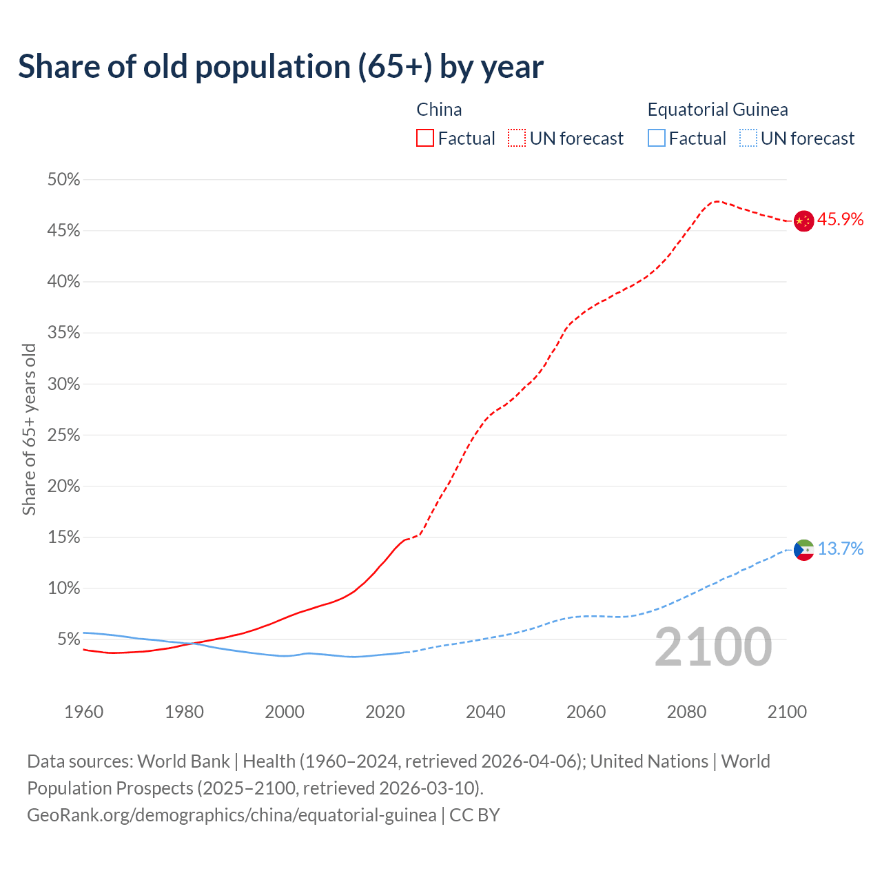 The share of older people aged 65 and over is 14.7% in China and 3.69% in Equatorial Guinea. Life expectancy in China compared to Equatorial Guinea .