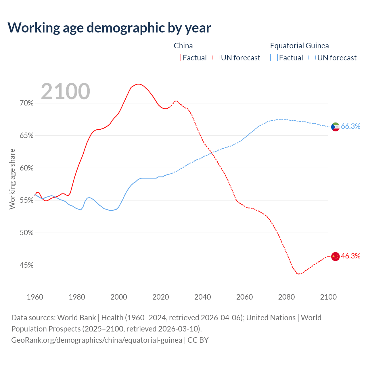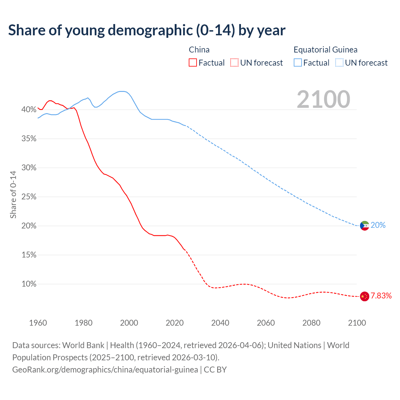 Median age China vs Equatorial Guinea, 1960-2100