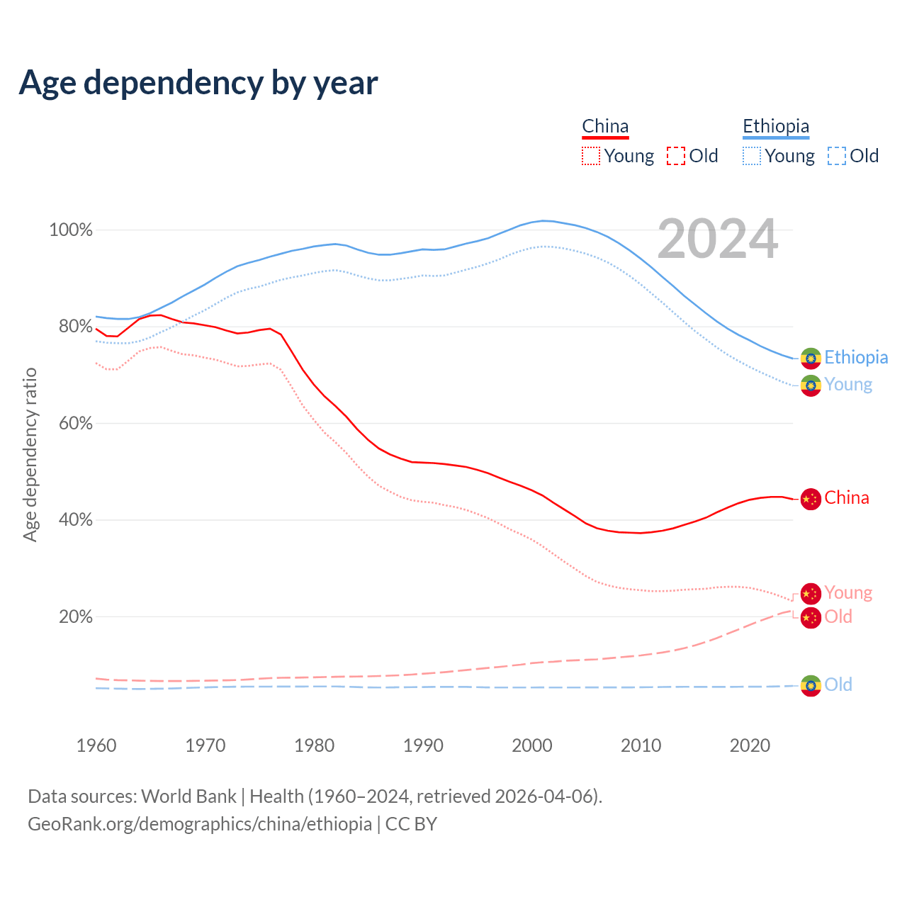 - China is ranked 44/196 by median age (oldest to youngest) vs 167/196 for Ethiopia.
