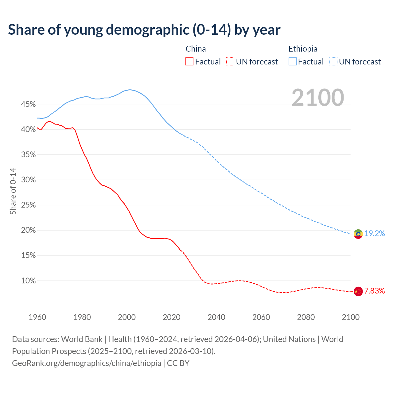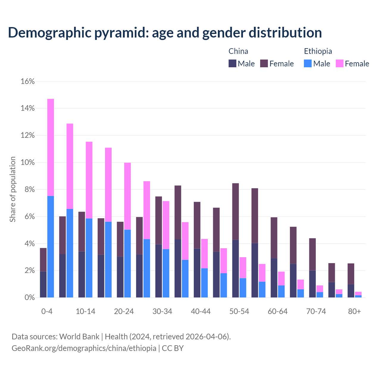 - As of 2026, the population of China is 1.4B vs 140M in Ethiopia - 10 times difference.