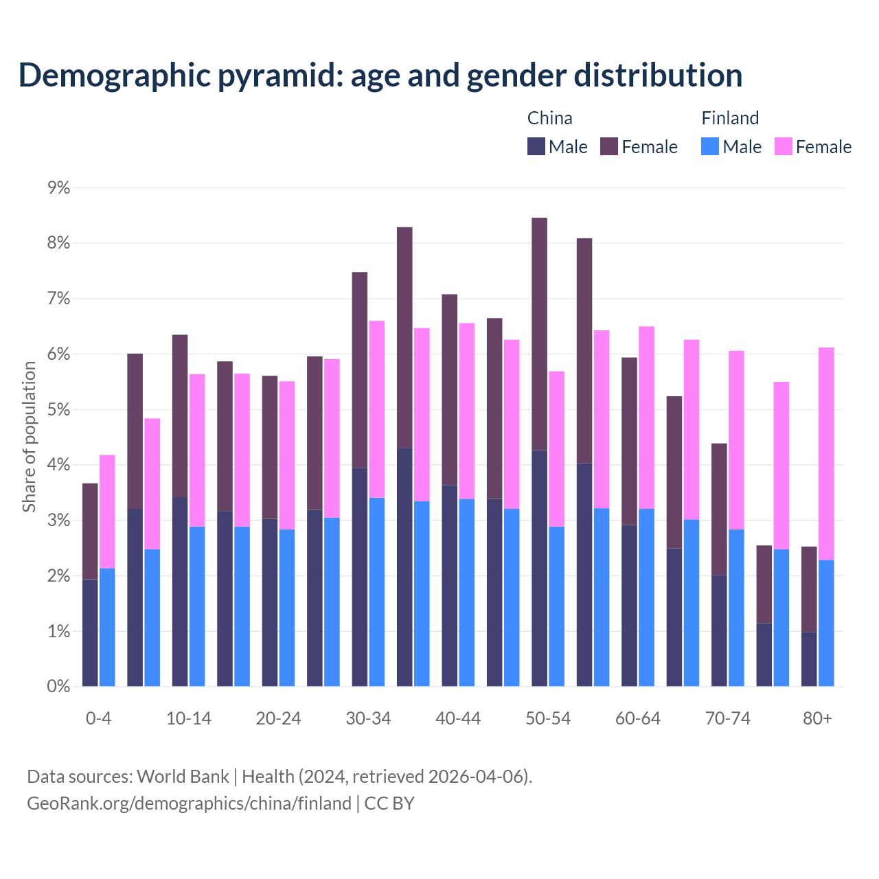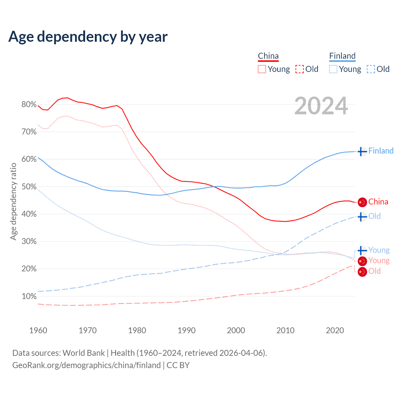 - China is ranked 44/196 by median age (oldest to youngest) vs 22/196 for Finland.