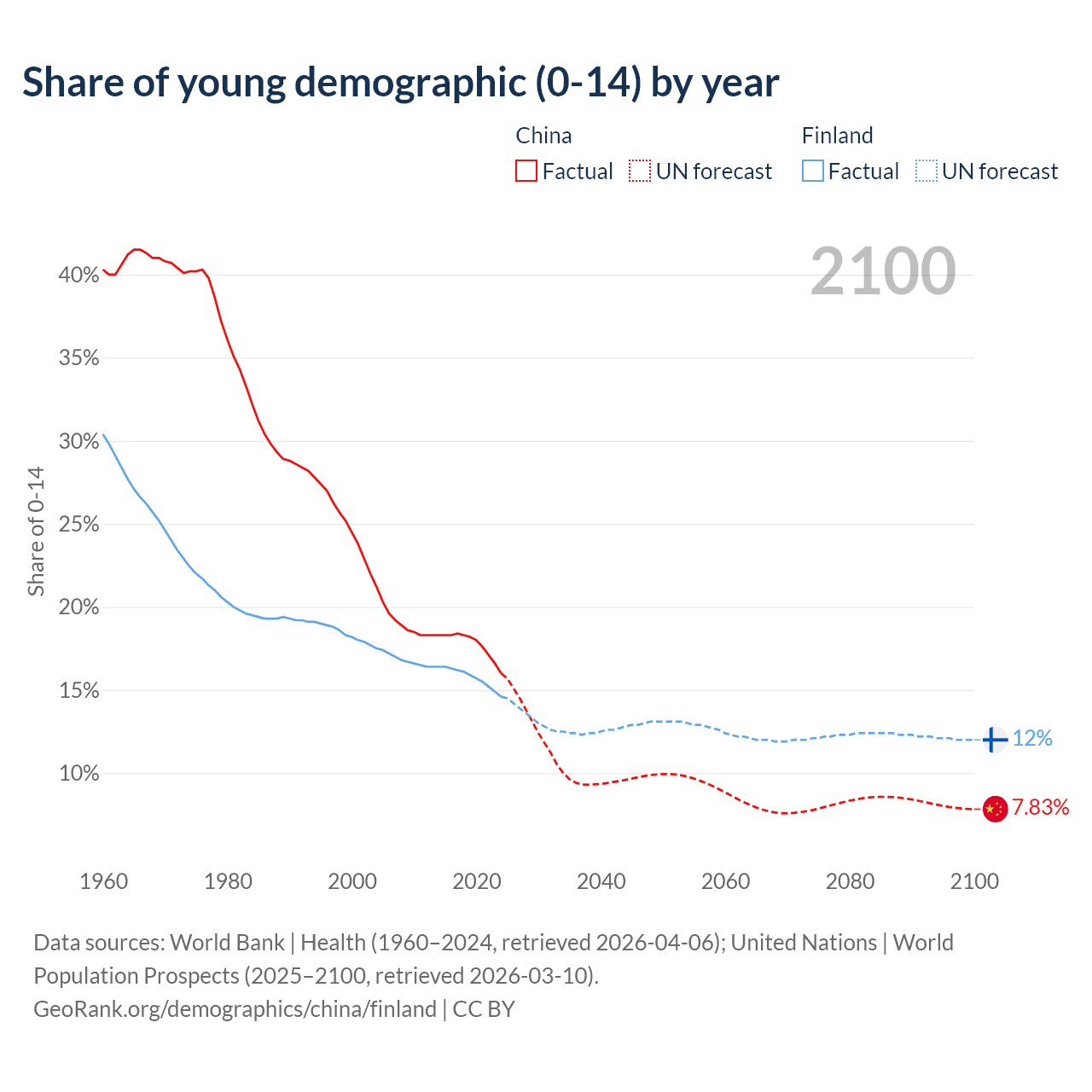- The share of young demographic (0-15 years old) in China is 16% vs 14.6% in Finland.