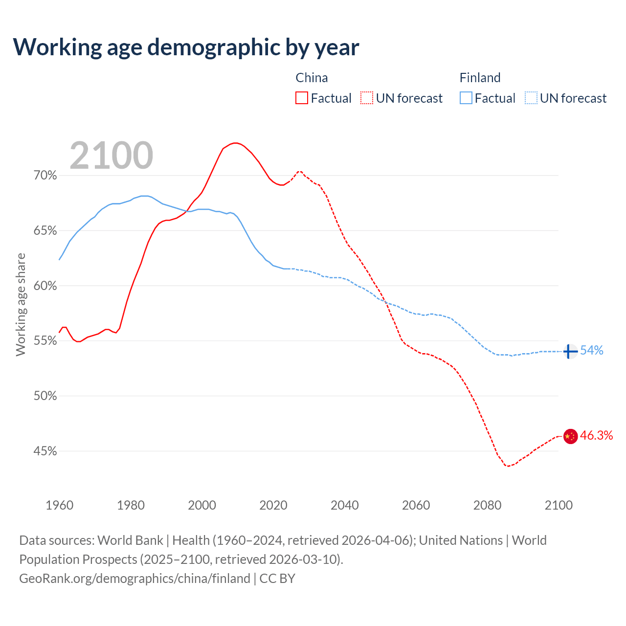 - China has 972M working age adults (aged 15-64) vs 3.46M in Finland.