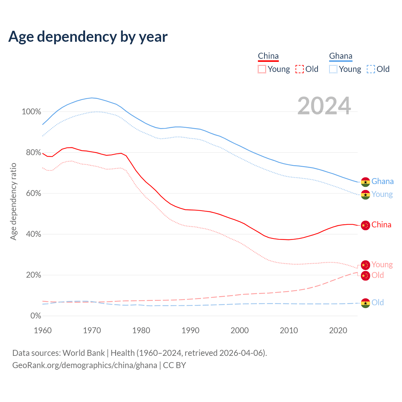 - China is ranked 44/196 by median age (oldest to youngest) vs 146/196 for Ghana.
