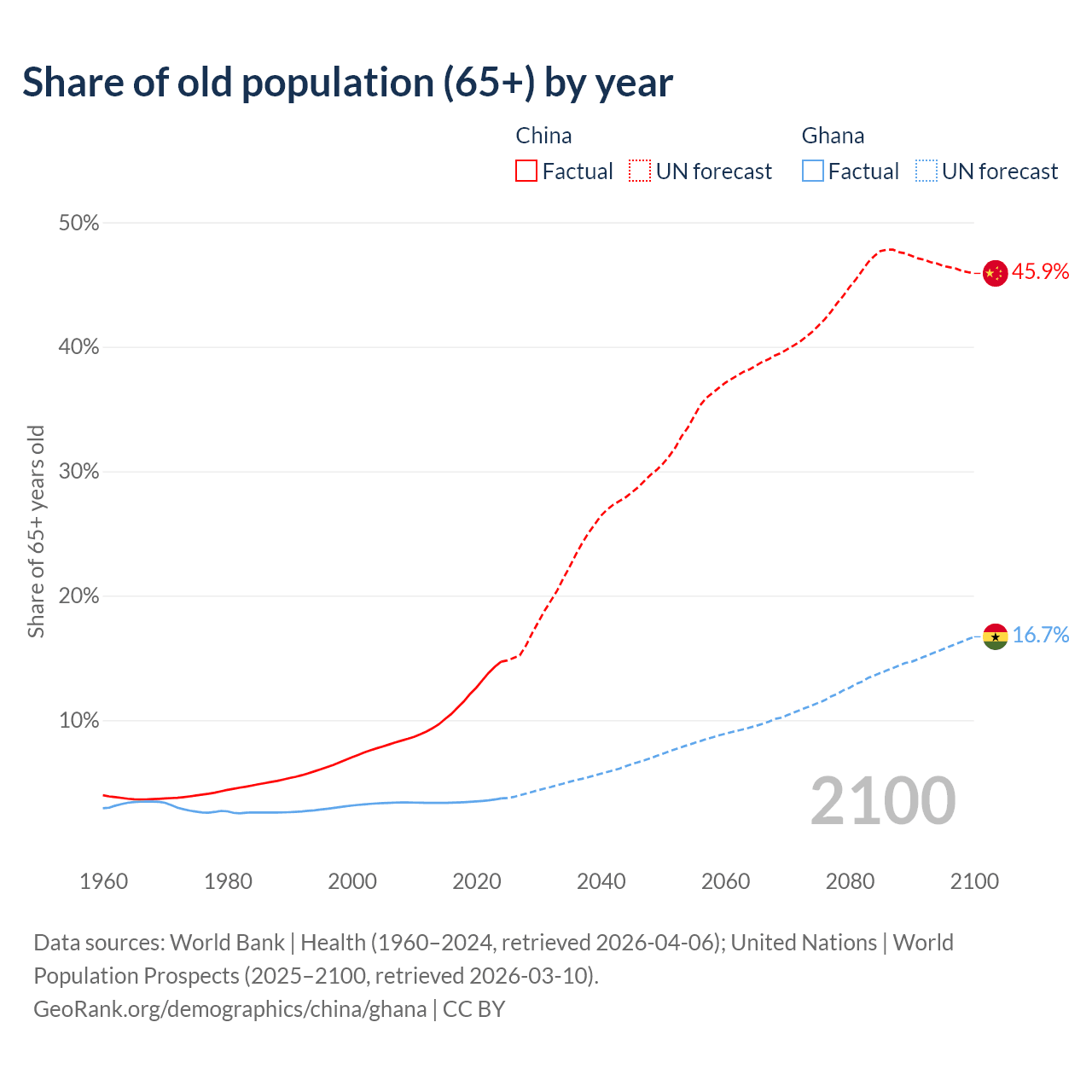 The share of older people aged 65 and over is 14.7% in China and 3.71% in Ghana. Life expectancy in China compared to Ghana .