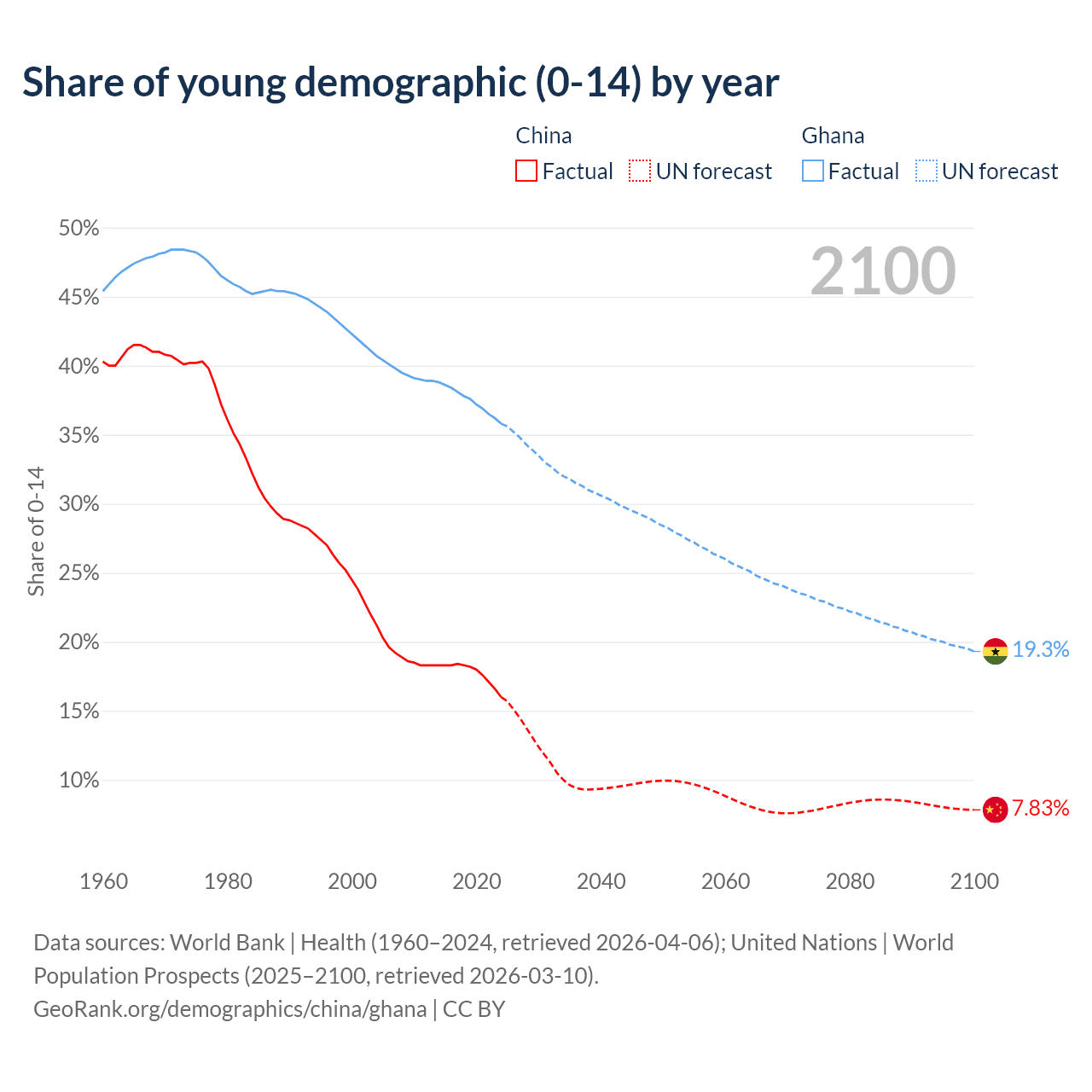 - The total fertility rate is 1 in China compared to 3.4 in Ghana.