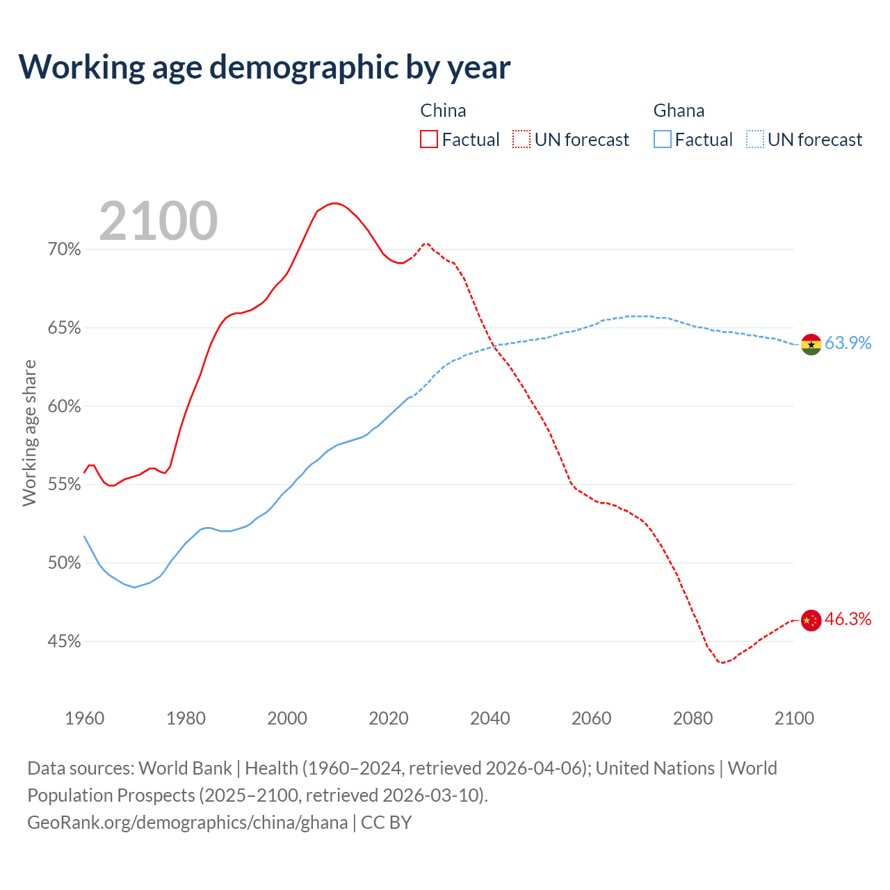 Median age China vs Ghana, 1960-2100