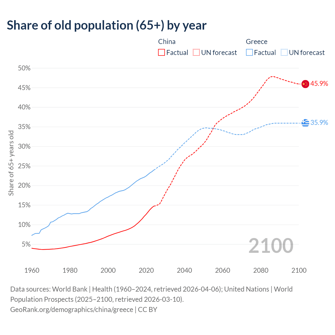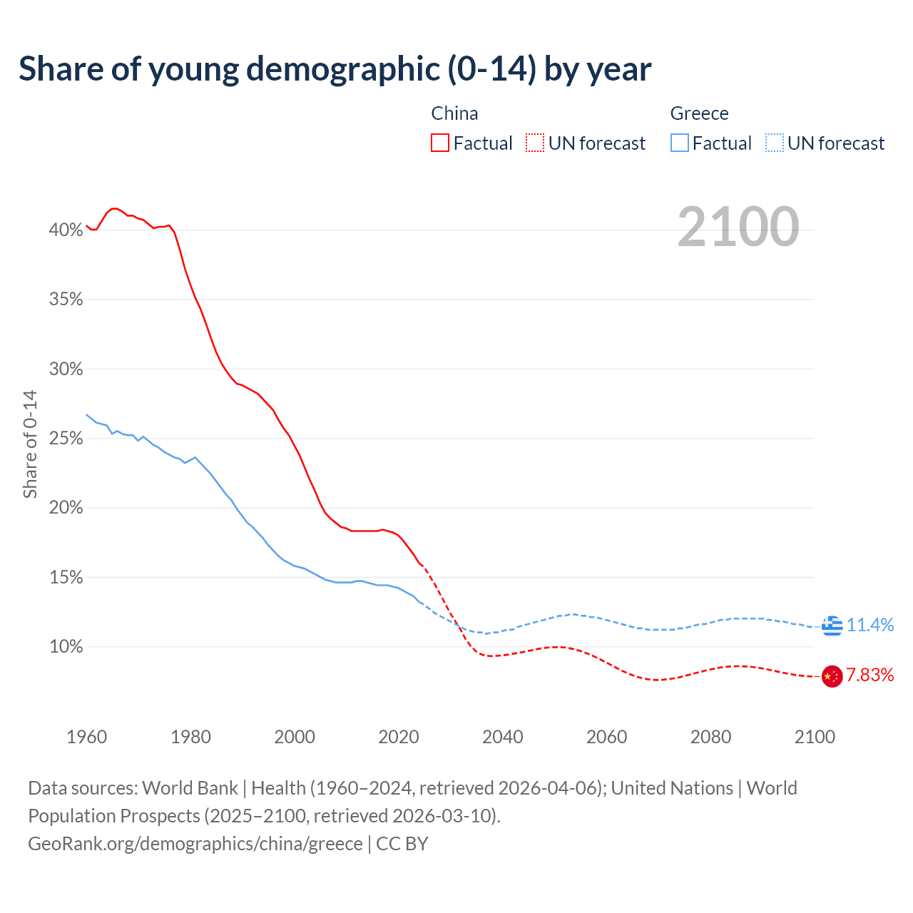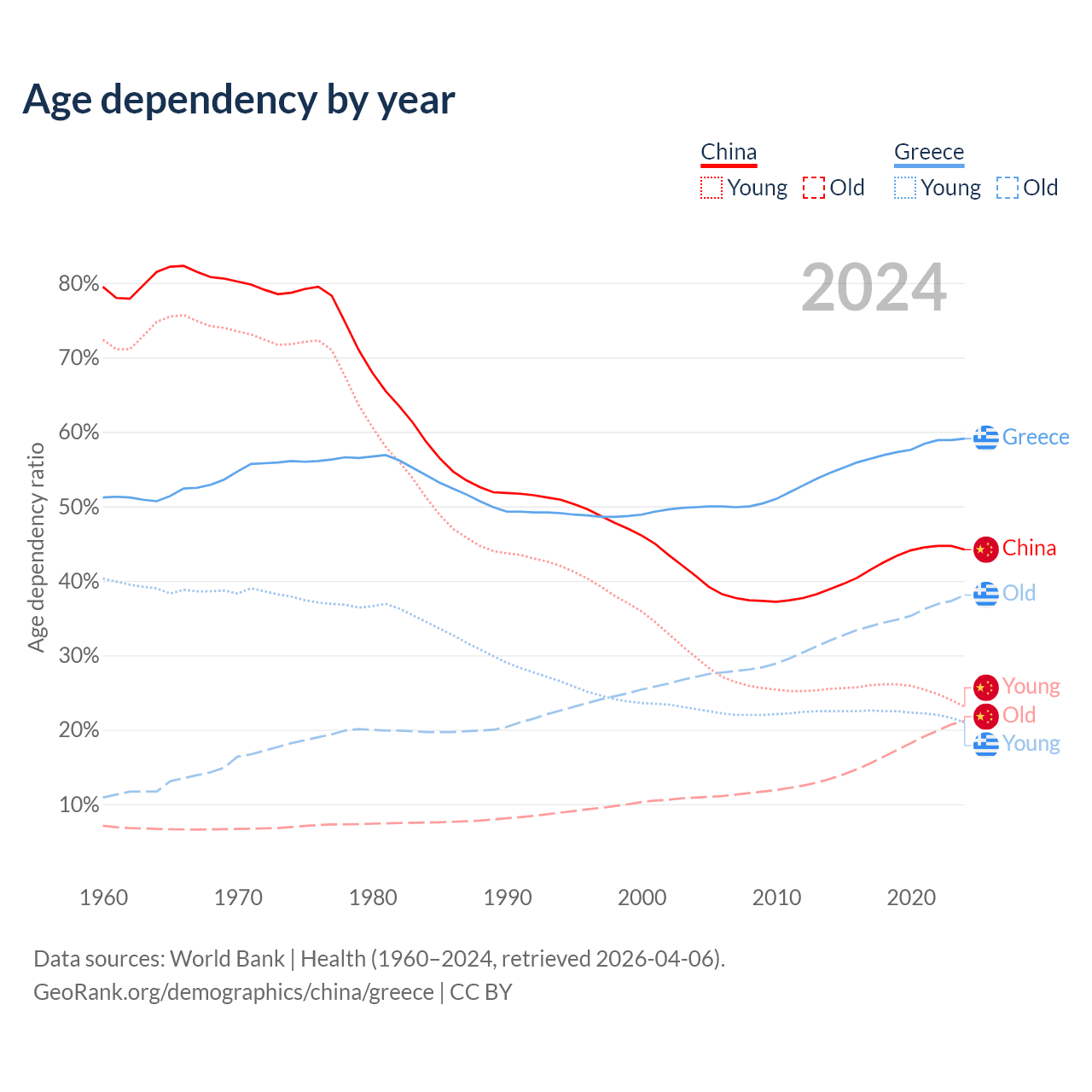 - China is ranked 44/196 by median age (oldest to youngest) vs 6/196 for Greece.