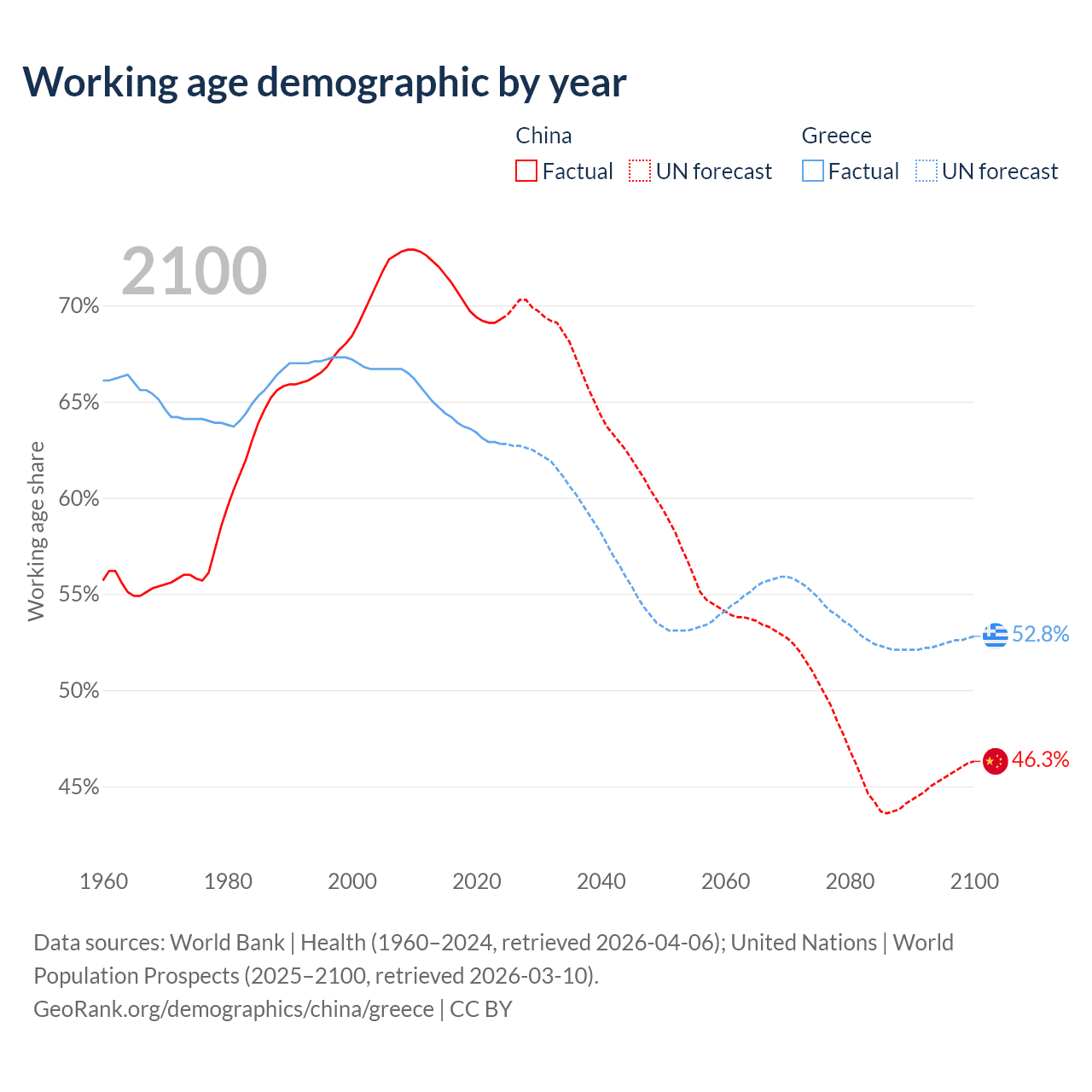 - China has 972M working age adults (aged 15-64) vs 6.4M in Greece.