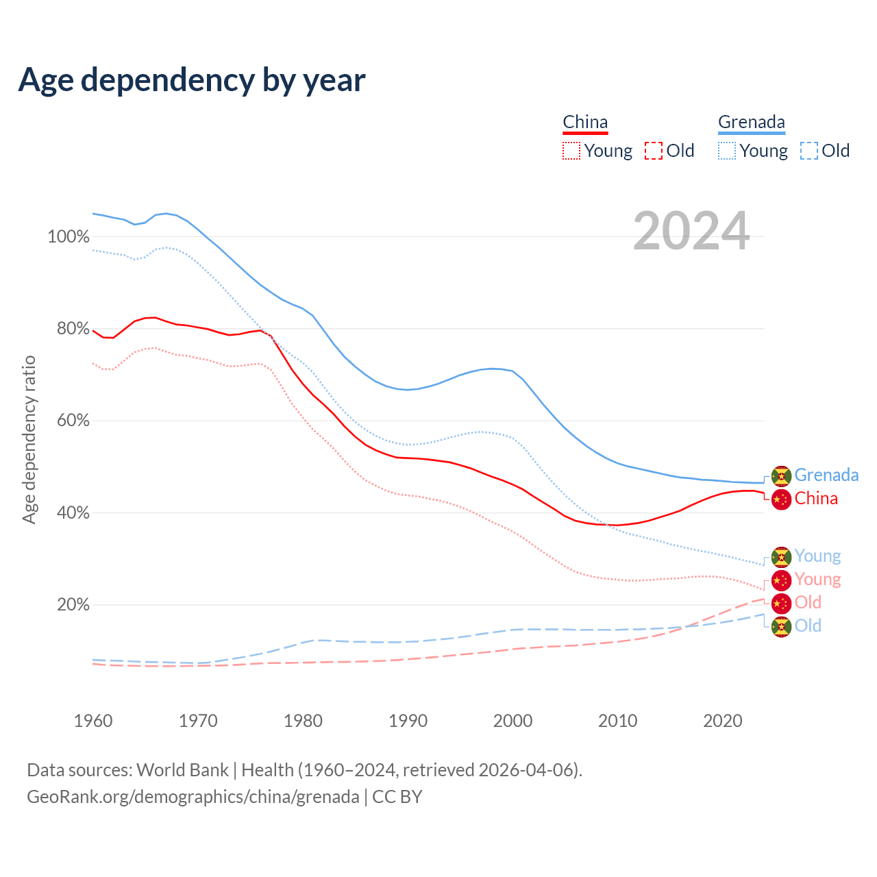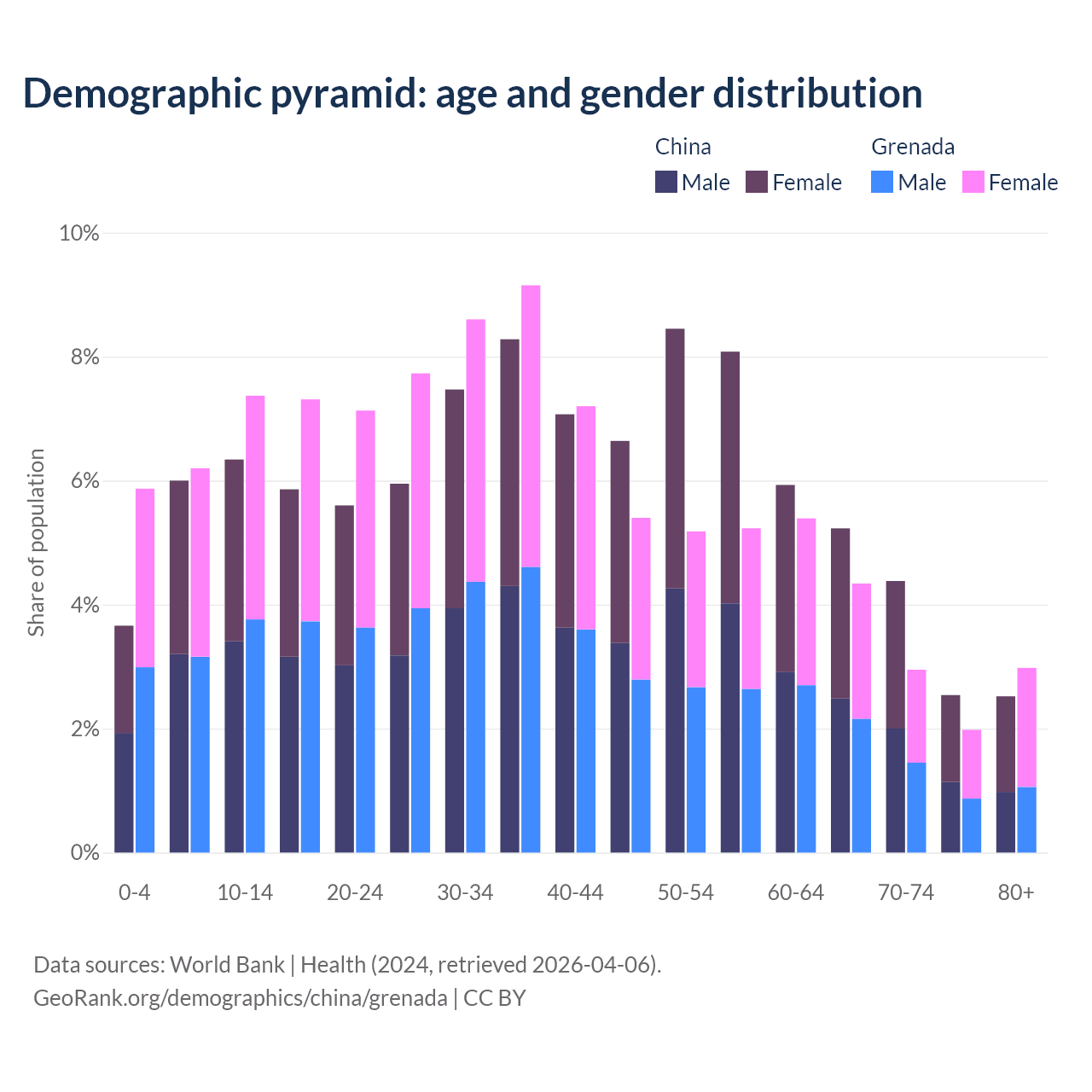 - China is ranked 44/196 by median age (oldest to youngest) vs 77/196 for Grenada.