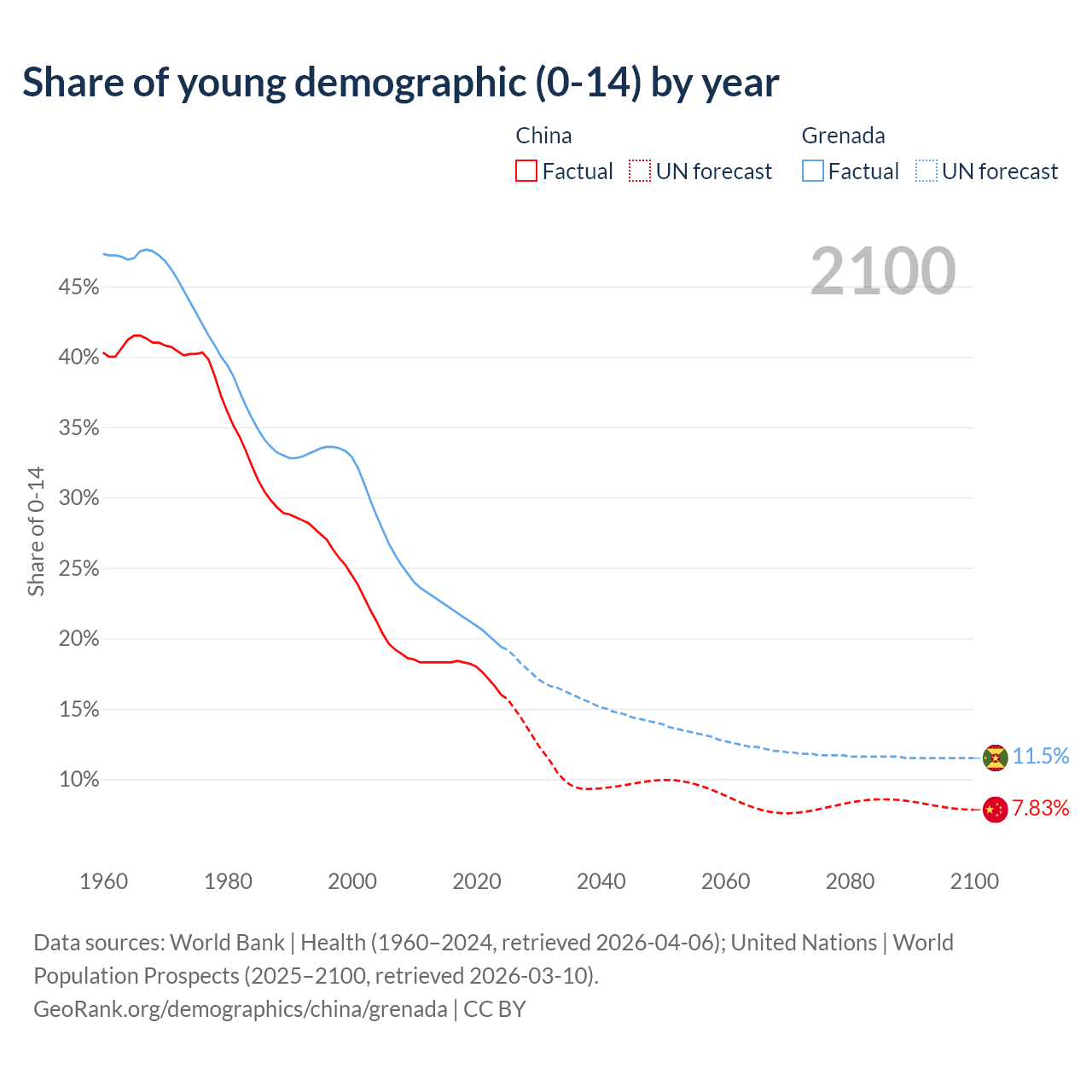 - The share of young demographic (0-15 years old) in China is 16% vs 19.4% in Grenada.