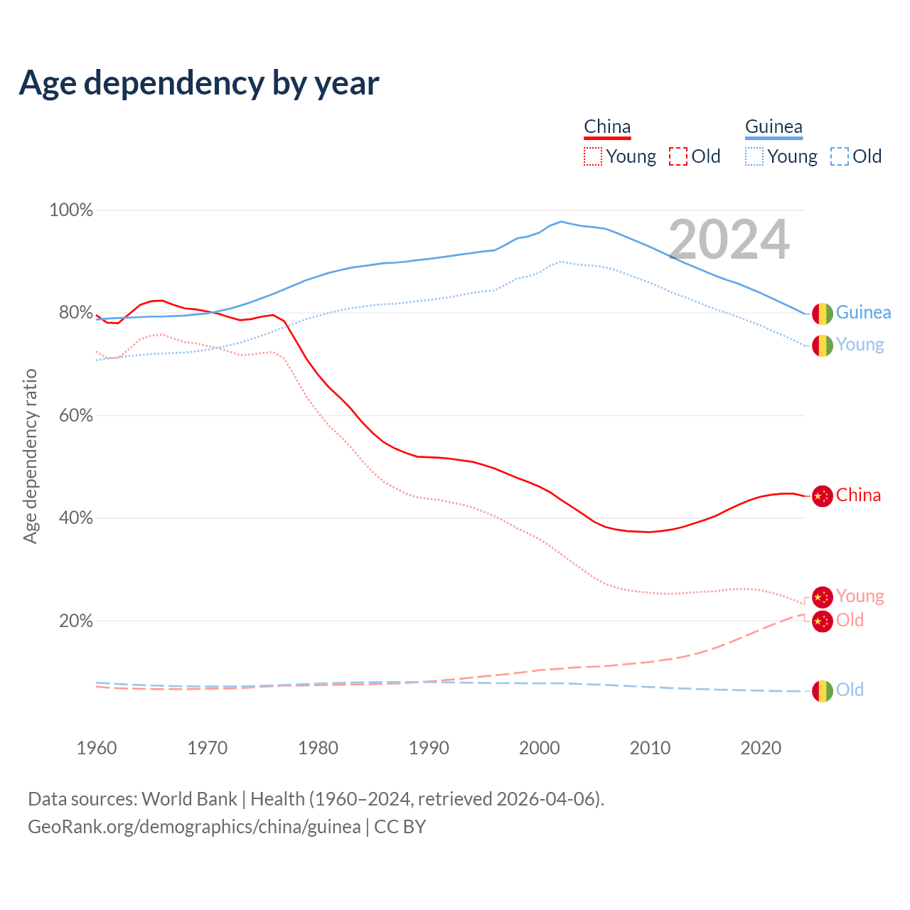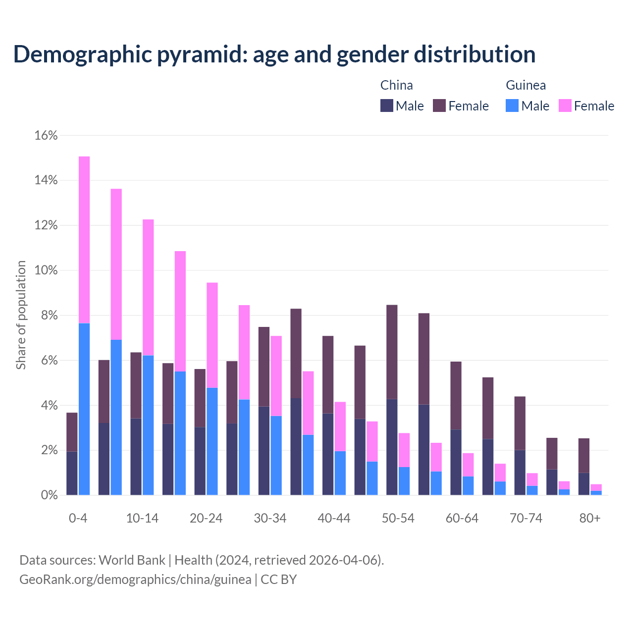 - China is ranked 44/196 by median age (oldest to youngest) vs 176/196 for Guinea.