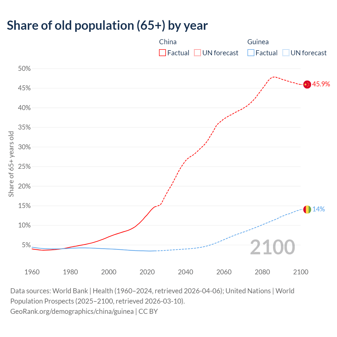 The share of older people aged 65 and over is 14.7% in China and 3.46% in Guinea. Life expectancy in China compared to Guinea .
