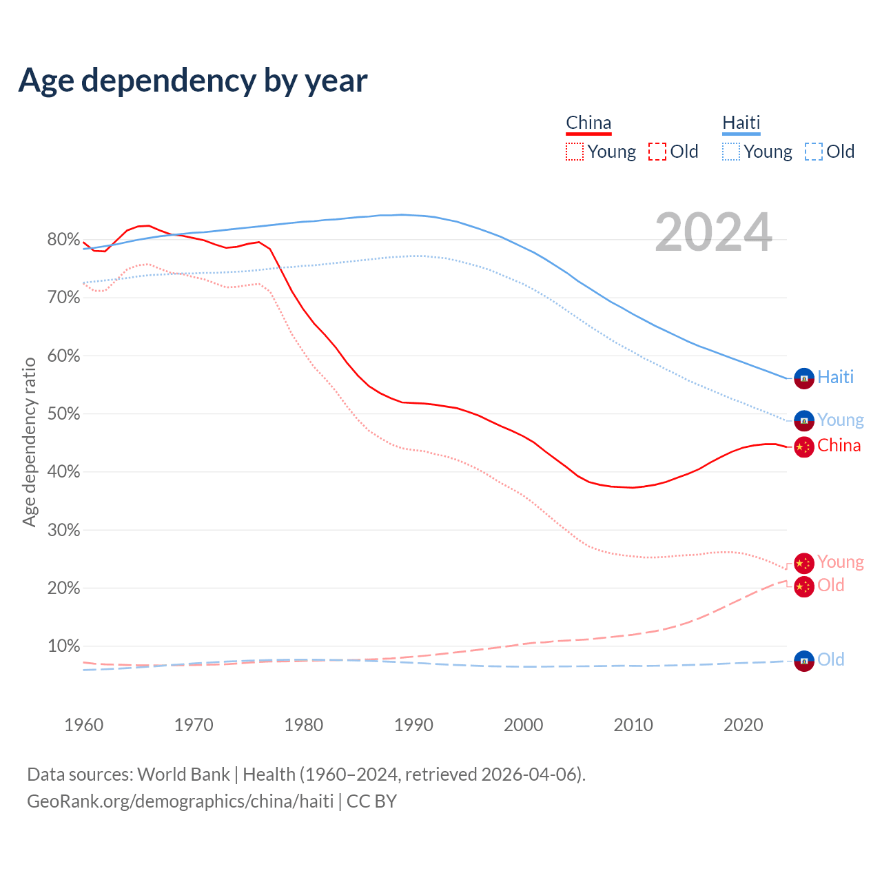 - China is ranked 44/196 by median age (oldest to youngest) vs 135/196 for Haiti.