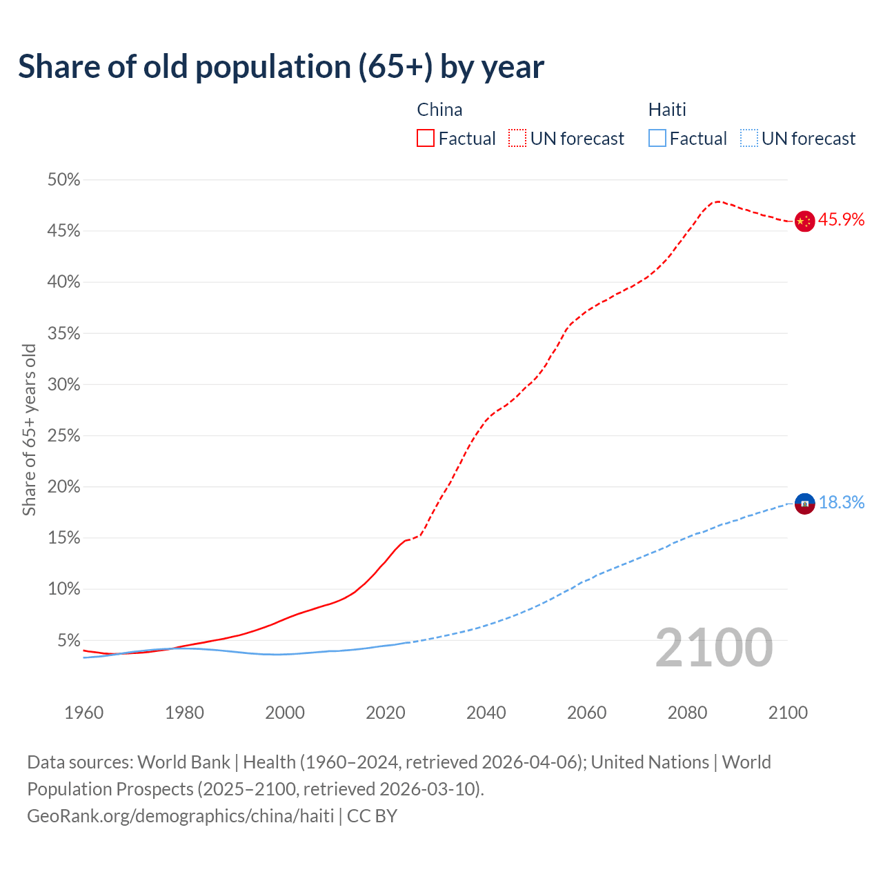 The share of older people aged 65 and over is 14.7% in China and 4.71% in Haiti. Life expectancy in China compared to Haiti .
