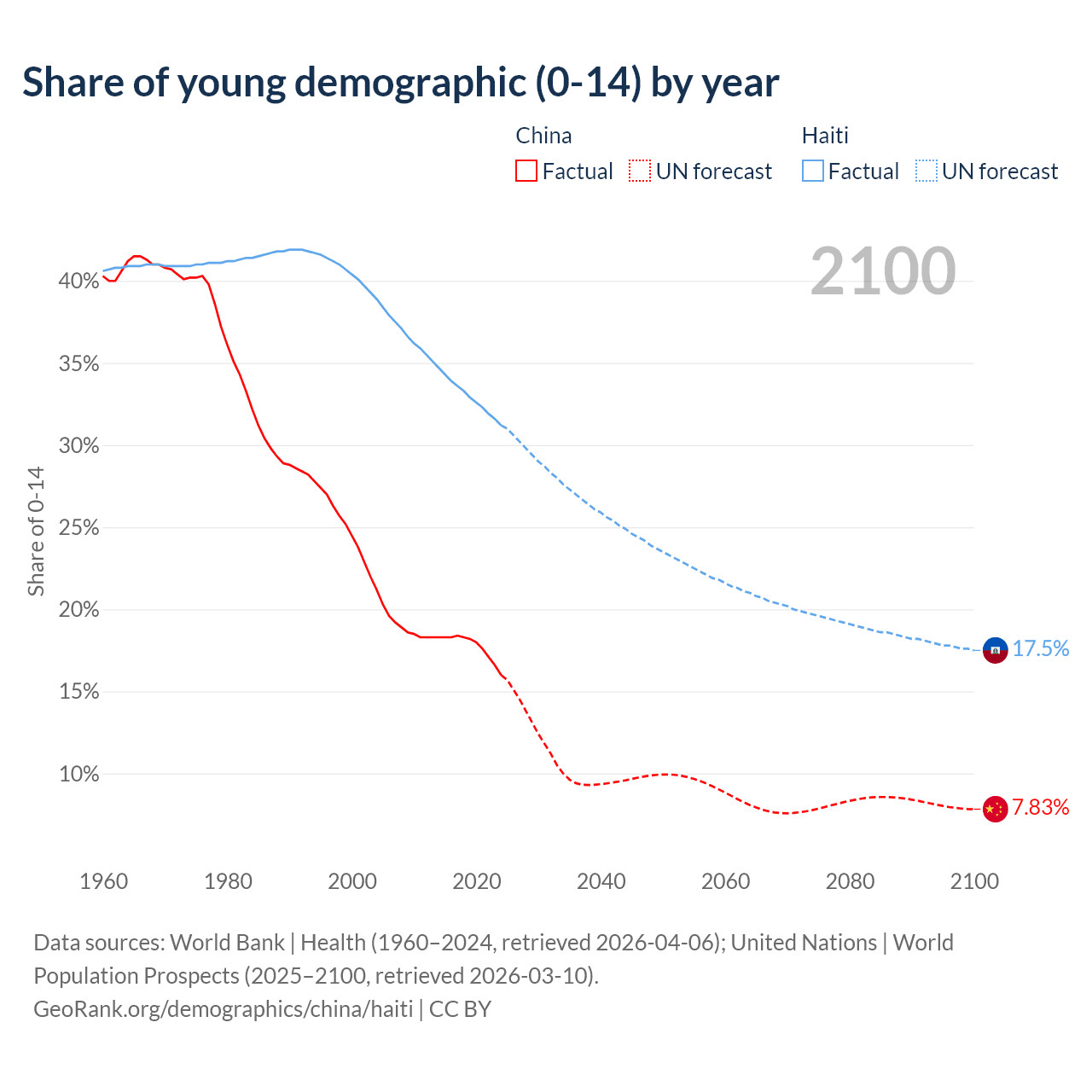 - The share of young demographic (0-15 years old) in China is 16% vs 31.2% in Haiti.