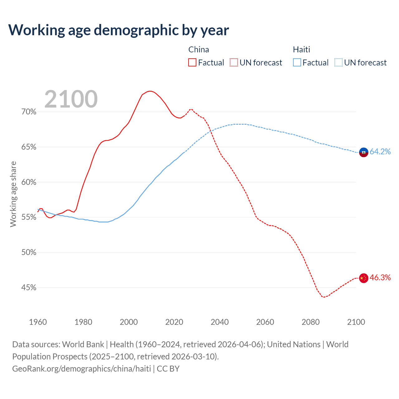 - China has 972M working age adults (aged 15-64) vs 7.74M in Haiti.