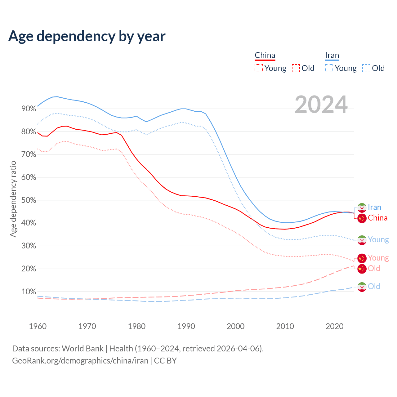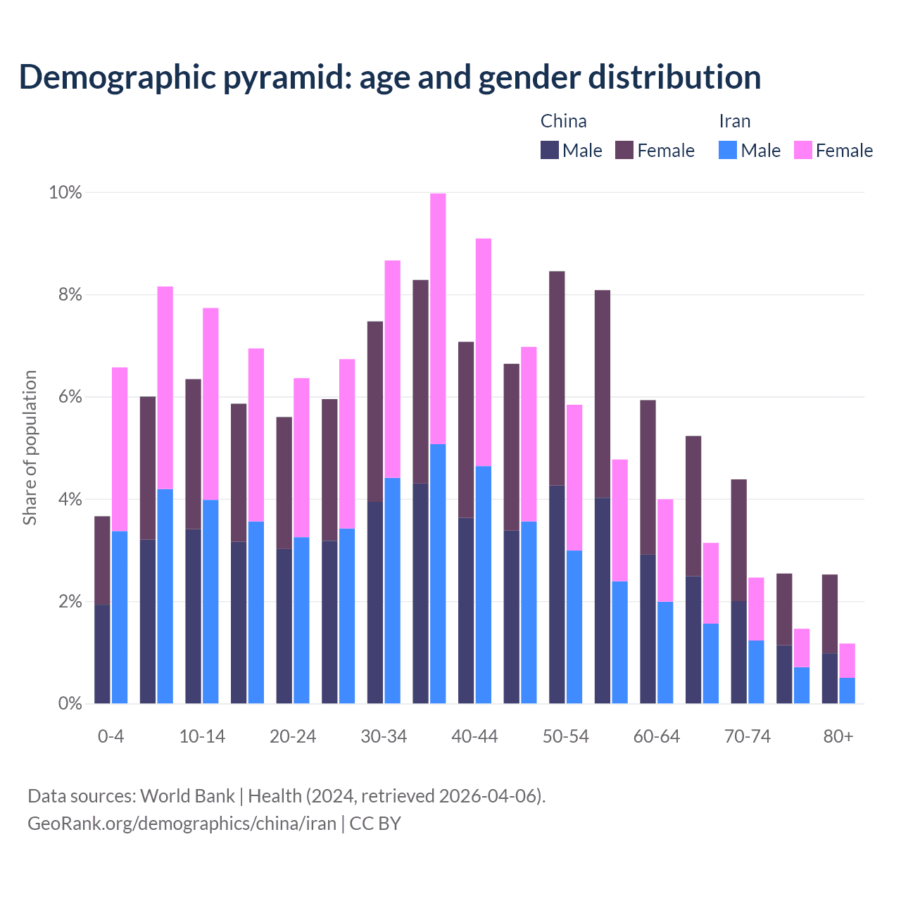 - China is ranked 44/196 by median age (oldest to youngest) vs 79/196 for Iran.