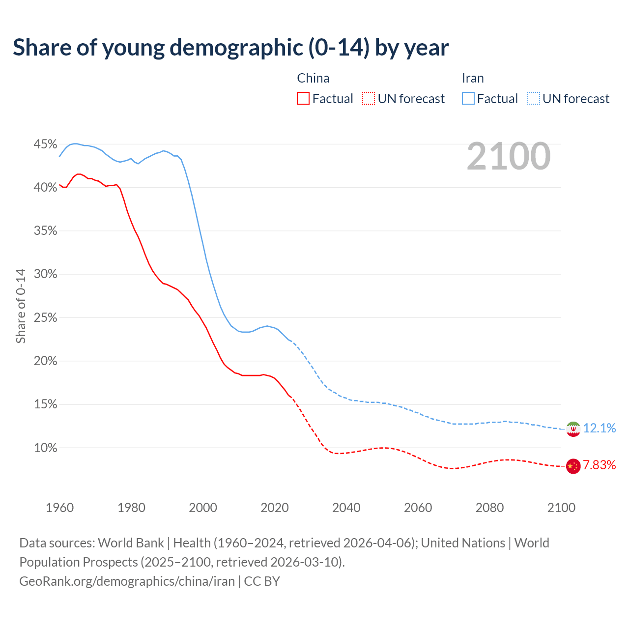 - The total fertility rate is 1 in China compared to 1.7 in Iran.