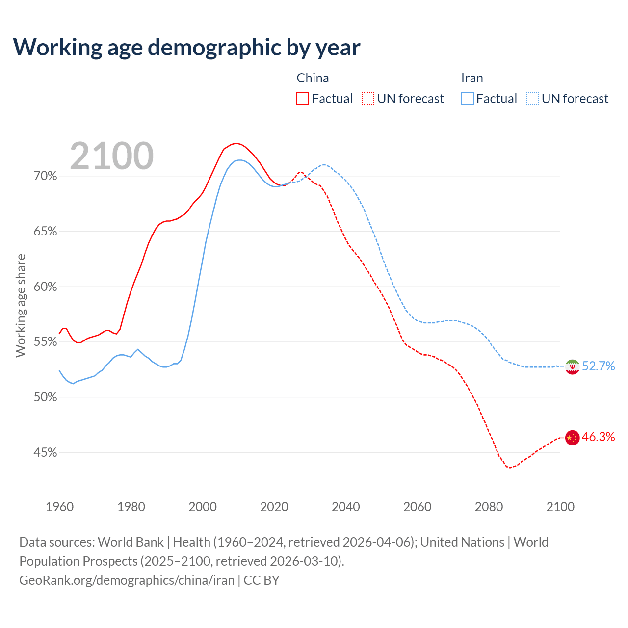 - China has 972M working age adults (aged 15-64) vs 64.8M in Iran.