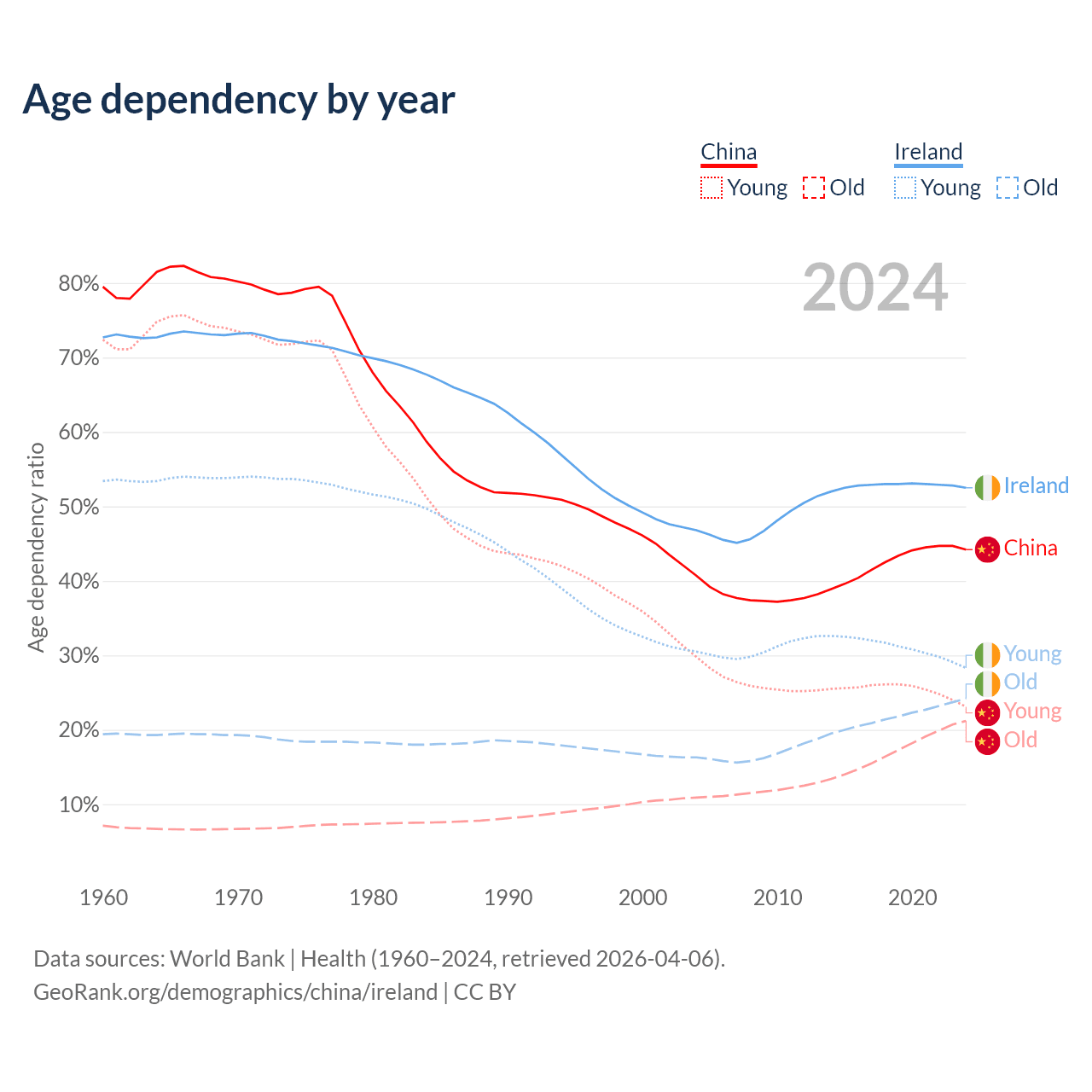 - China is ranked 44/196 by median age (oldest to youngest) vs 48/196 for Ireland.