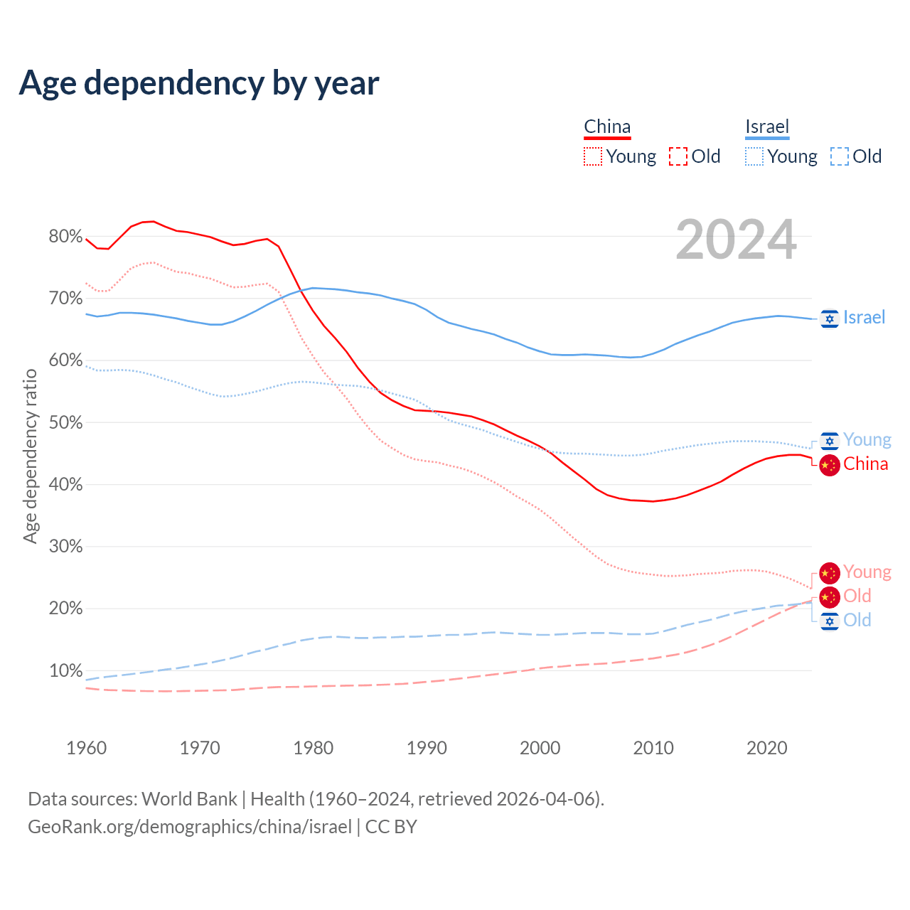 - China is ranked 44/196 by median age (oldest to youngest) vs 103/196 for Israel.