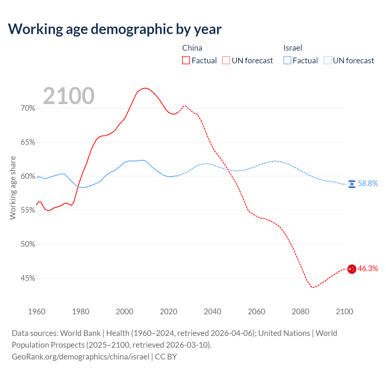 Median age China vs Israel, 1960-2100