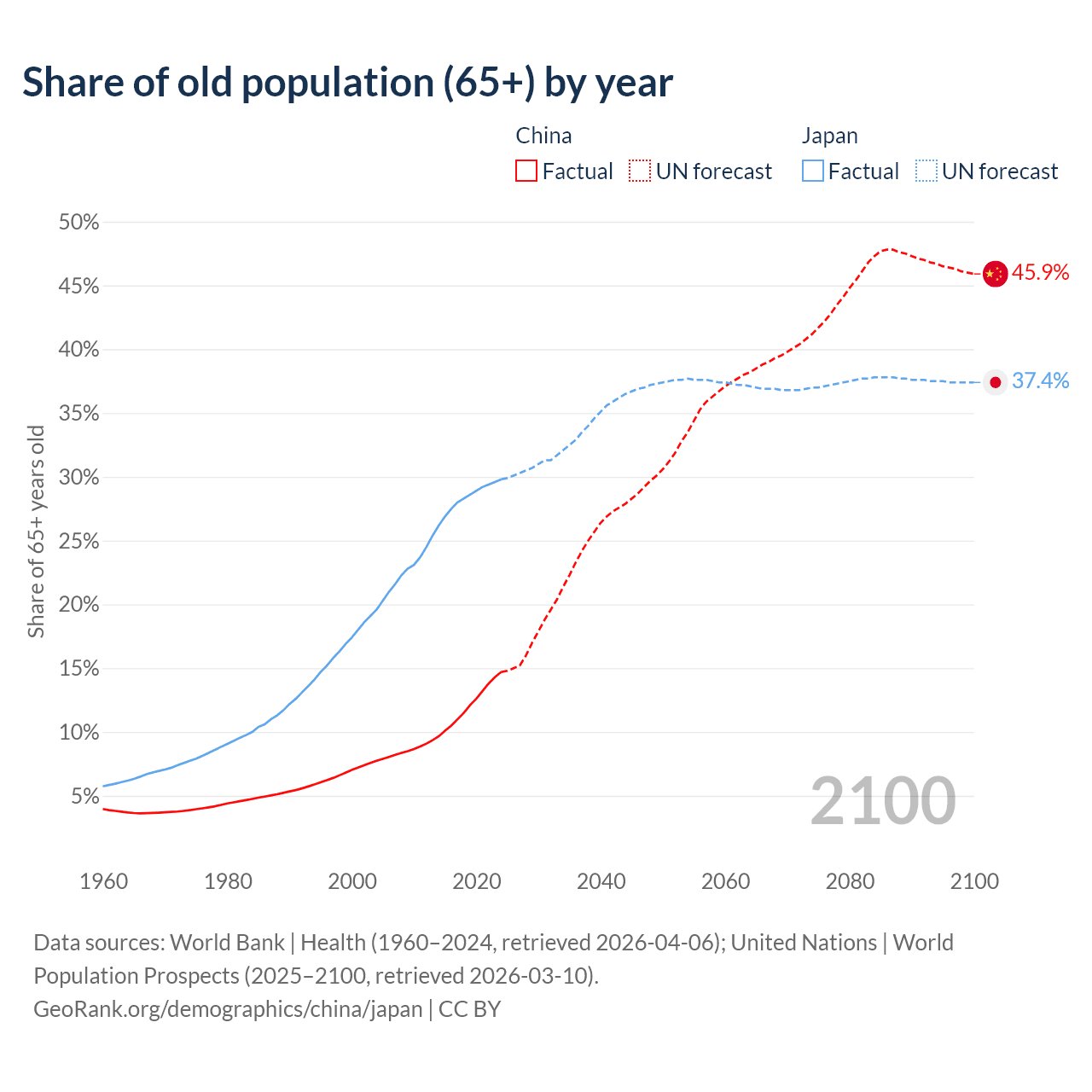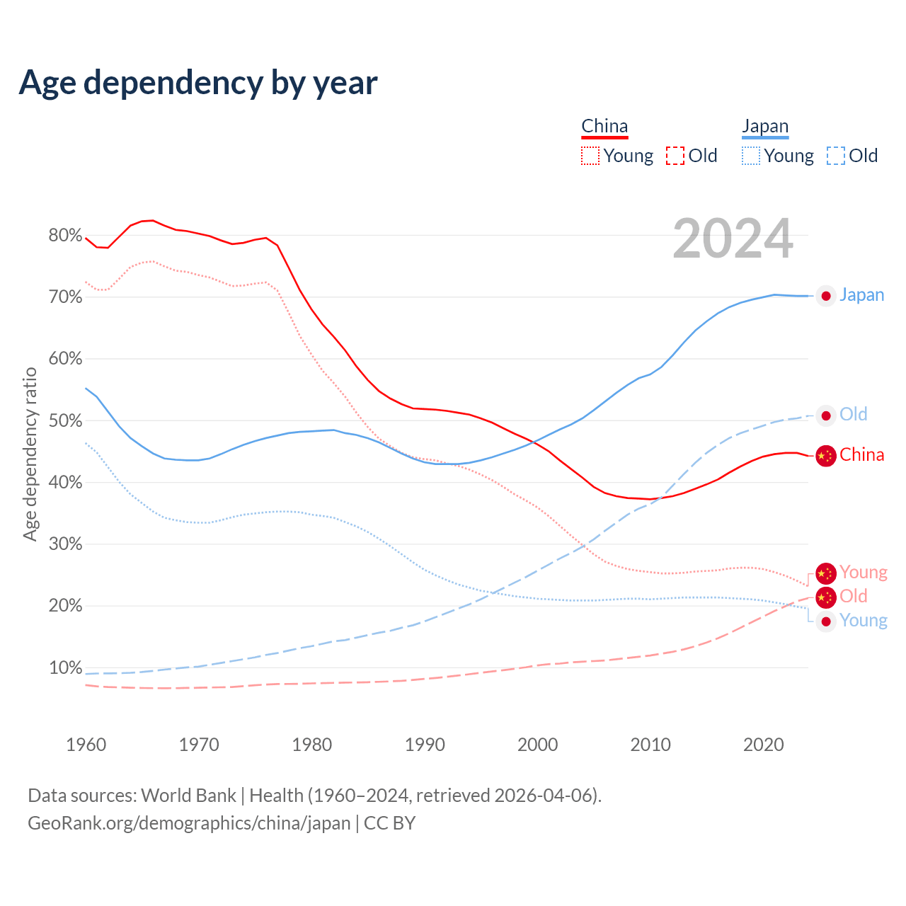 - China is ranked 44/196 by median age (oldest to youngest) vs 2/196 for Japan.