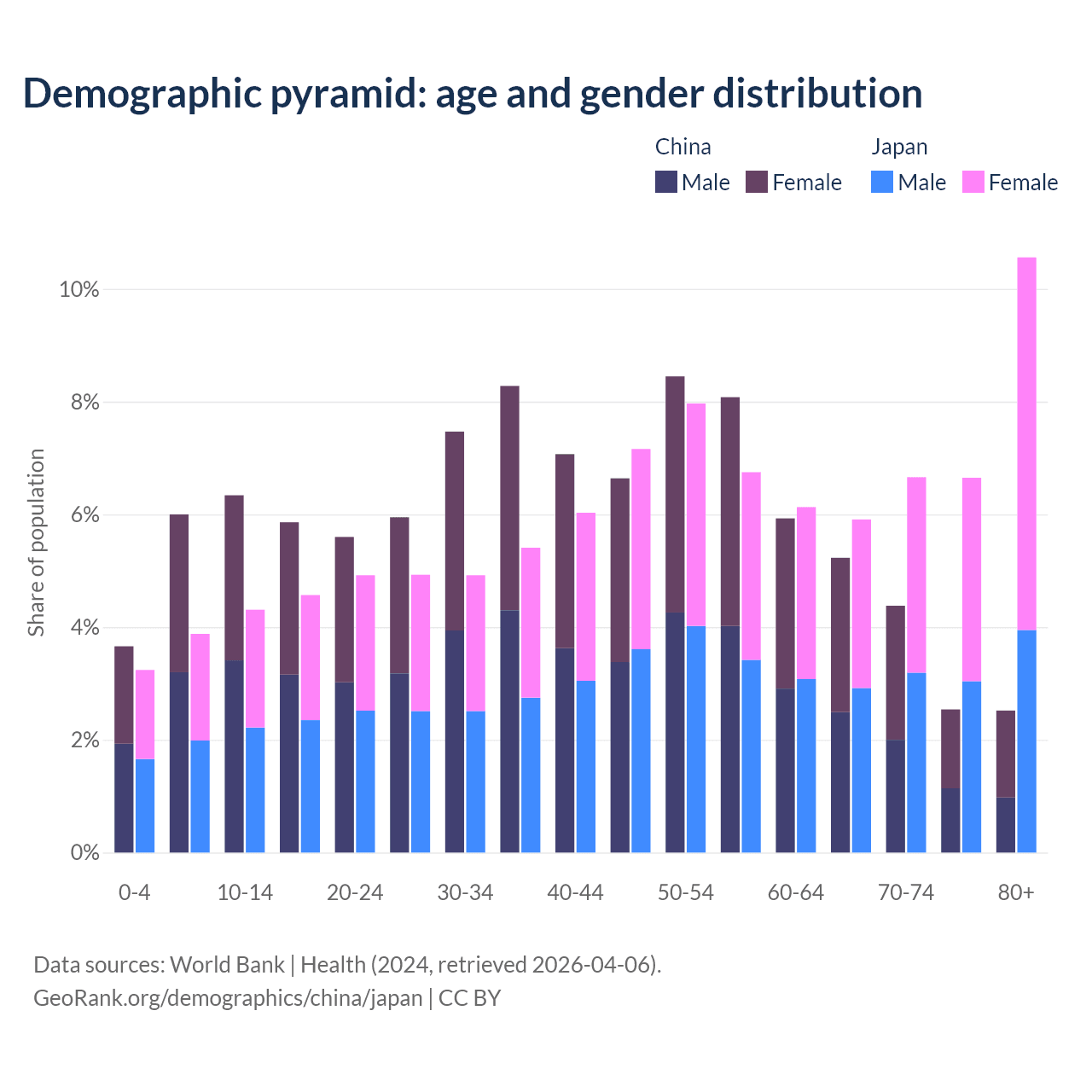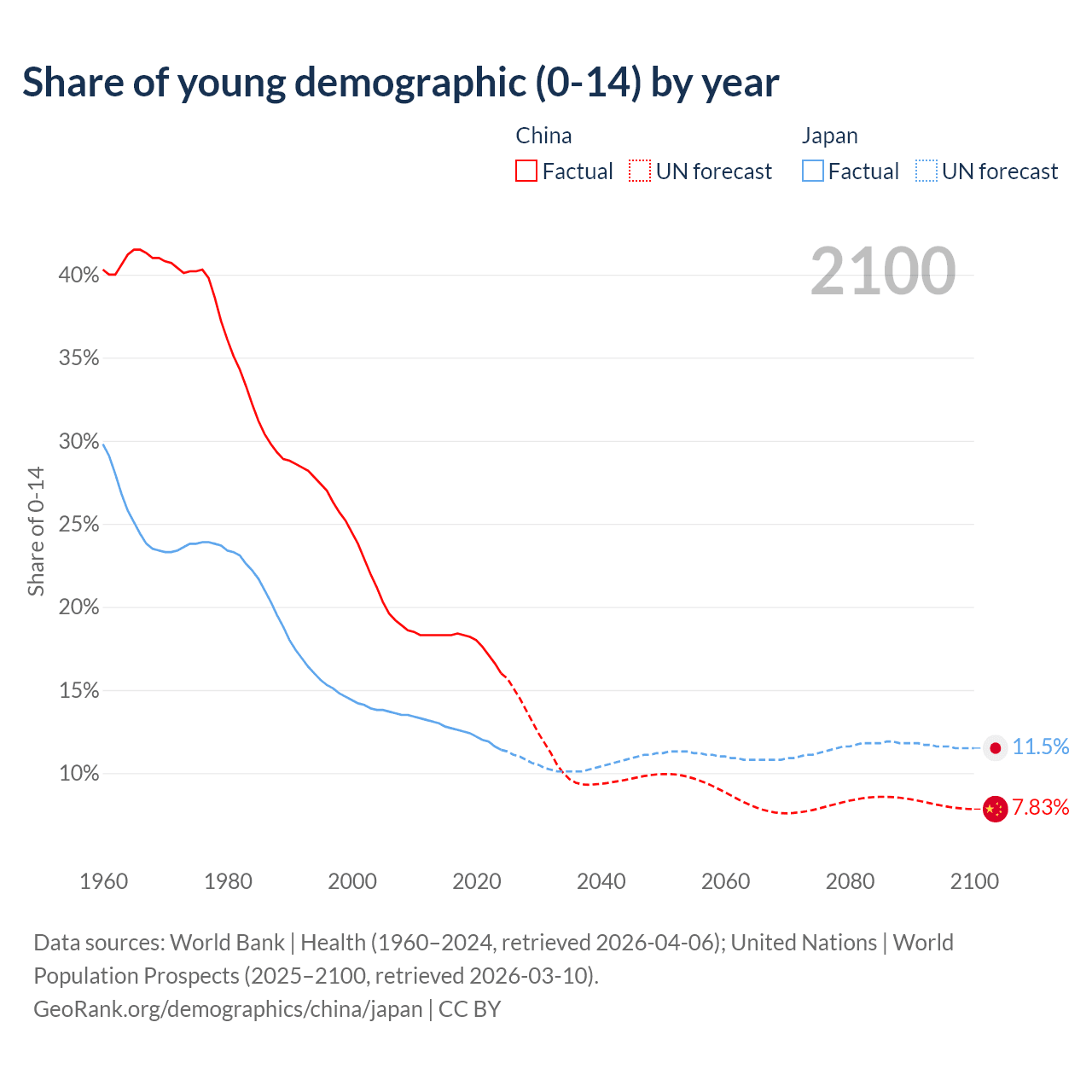- As of 2026, the population of China is 1.4B vs 123M in Japan - 11.4 times difference.
