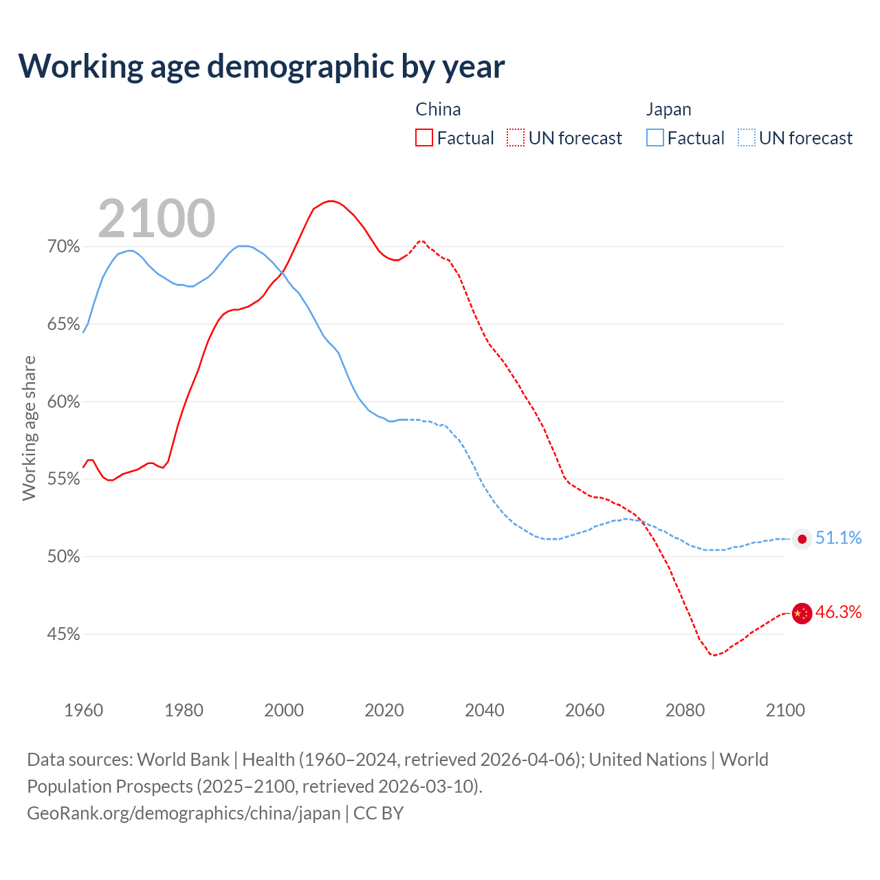 - China has 972M working age adults (aged 15-64) vs 72.1M in Japan.